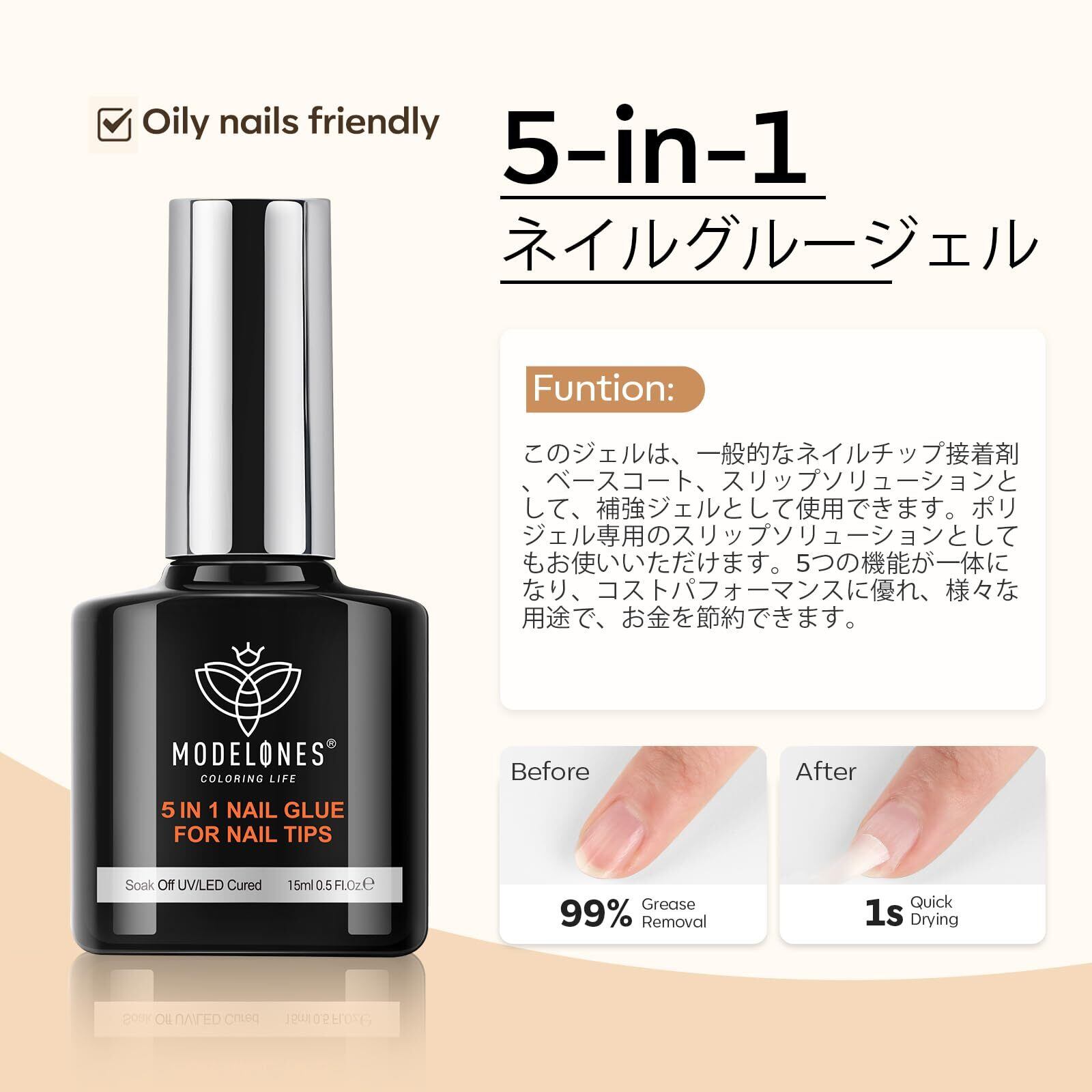 Modelones ジェルネイル トップコート ベースコート5in1ジェルネイル UV/LED対応 低臭 長持ち 透明感 3本セット 初心者 10ml*3セット ポリッシュ ネイルジェル