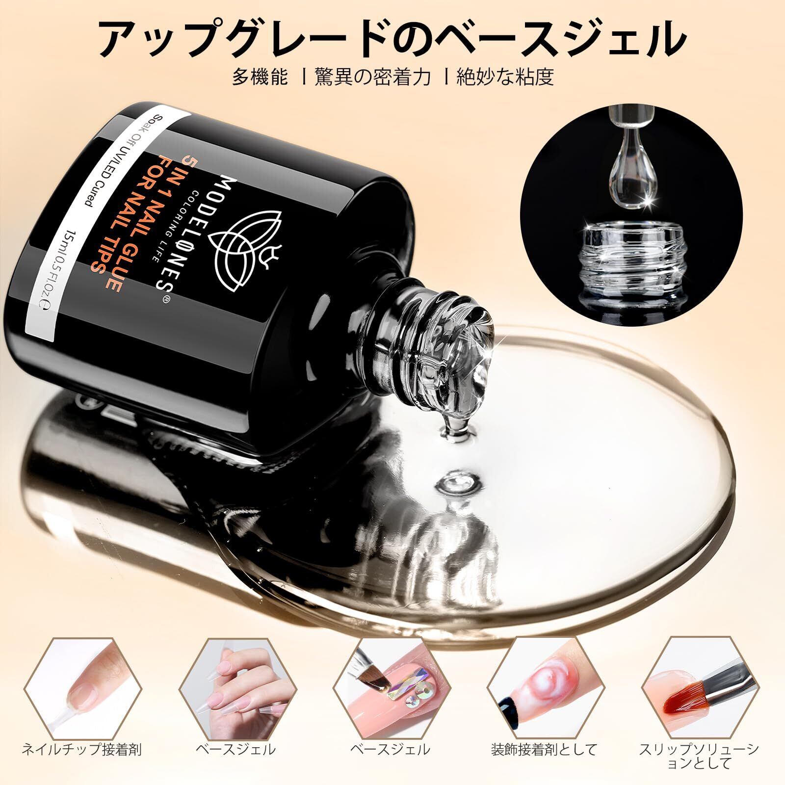 ソークオフベースジェル(15 ml):自爪への負担が最小限に抑え、さらにジェルの密着度を高めます。自爪に直接塗布するジェルだからこそ成分や負担を軽減。驚きの艶感。絶妙な粘度で流れにくいから取り扱いやすい。密着力で浮きや剥がれもない