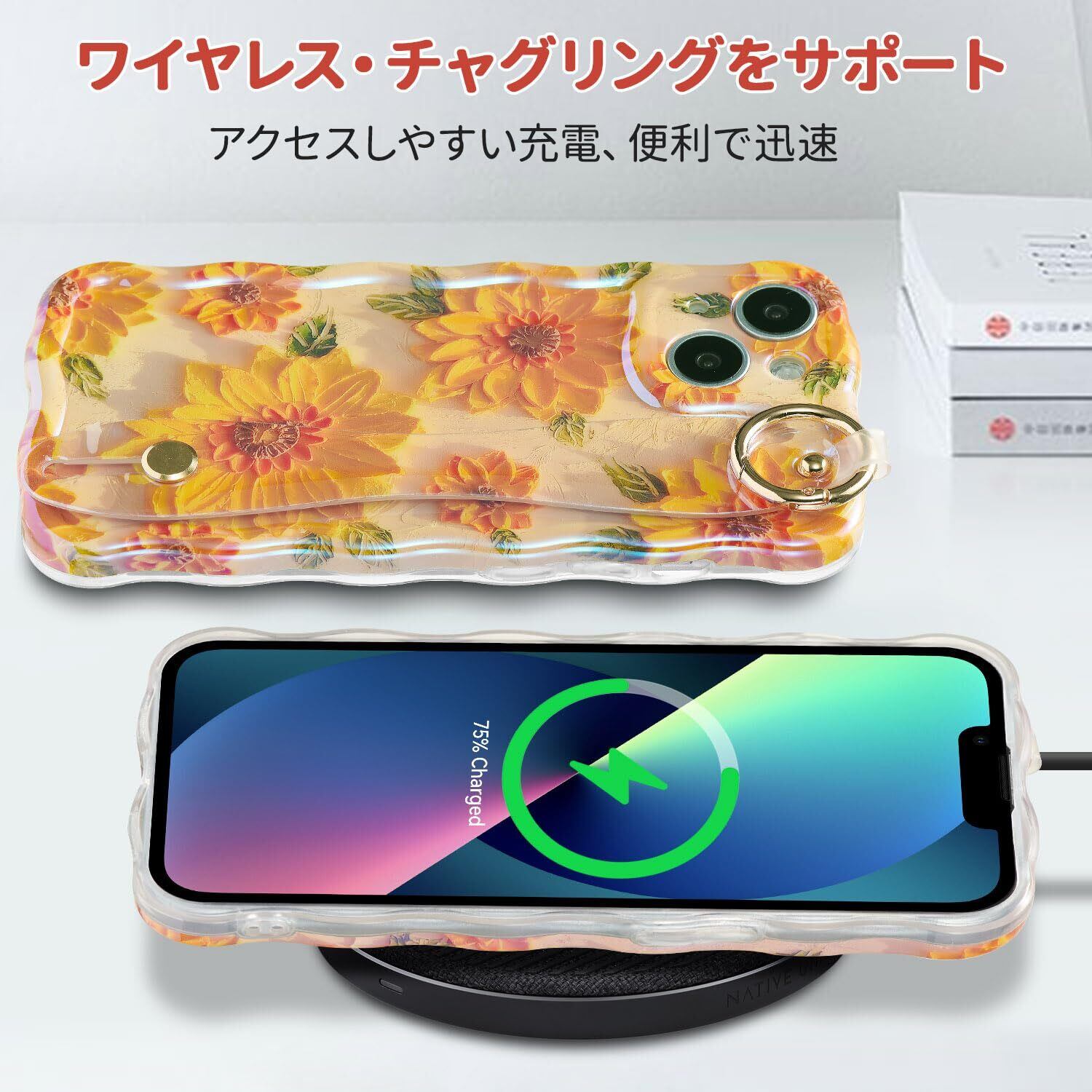 QLTYPRI iPhone 15 用 ケース TPUカバー ウェーブ おしゃれ 韓国 可愛い 花柄 薄型 軽量 耐衝撃 スマホケース ハンドベルト付き カラビナリング付き スタンド機能 ワイヤレス充電対応 ストラップホール付き アイフォン15 ケース 6.1インチ 対応 - イエロー
