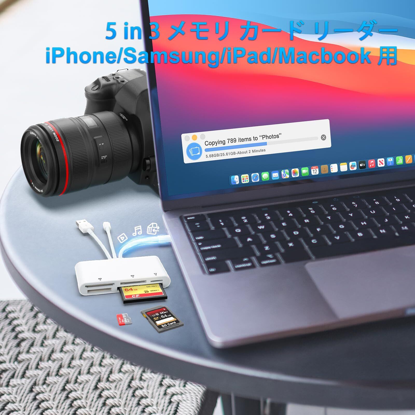 【高安定性データ転送】iphone sdカードリーダーは最大480Mbpsのメモリカードをサポートし、高解像度のHDムービー、画像、ビデオ録画をより高速かつ効率的にコンピューターに転送します。このユーザーフレンドリーで効率的なUSBカードリーダーで、さらに高速なデータ転送をお楽しみください。
