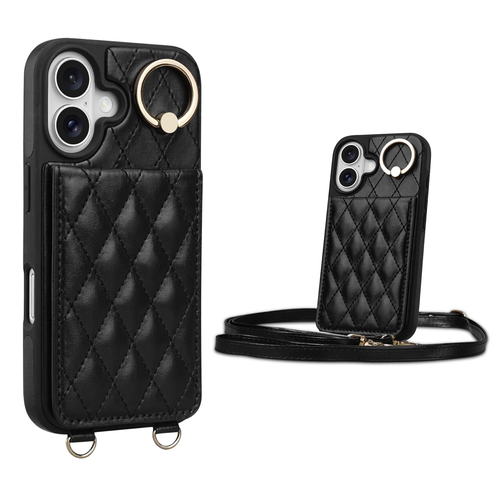 Shlybaay iPhone 16 Plus 対応 ケース 背面 手帳型 カードケース iPhone16 Plus 用 ショルダー ストラップ 背面ケース 手帳型ケース キルティング iPhone 16 Plus アイホン 16 プラス 用 スタンド 肩掛け カード収納 斜め掛け 首掛け PUレザー マグネット 可愛い チェック柄 格子柄 女性 菱形 おしゃれ 6.7inch ブラック