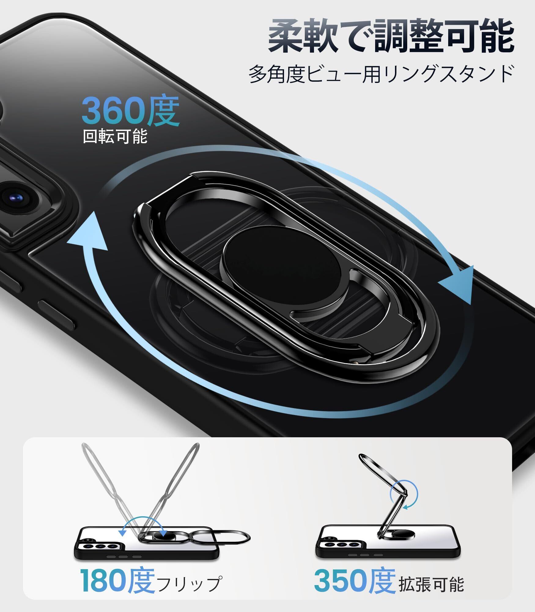 【自由に回転するリングスタンド】 このSamsung Galaxy S22のケースには、360°回転するベースと、それぞれ最大180°および350°まで調節可能な2つのアームが搭載されています。多彩なハンズフリー視聴オプションを提供します。