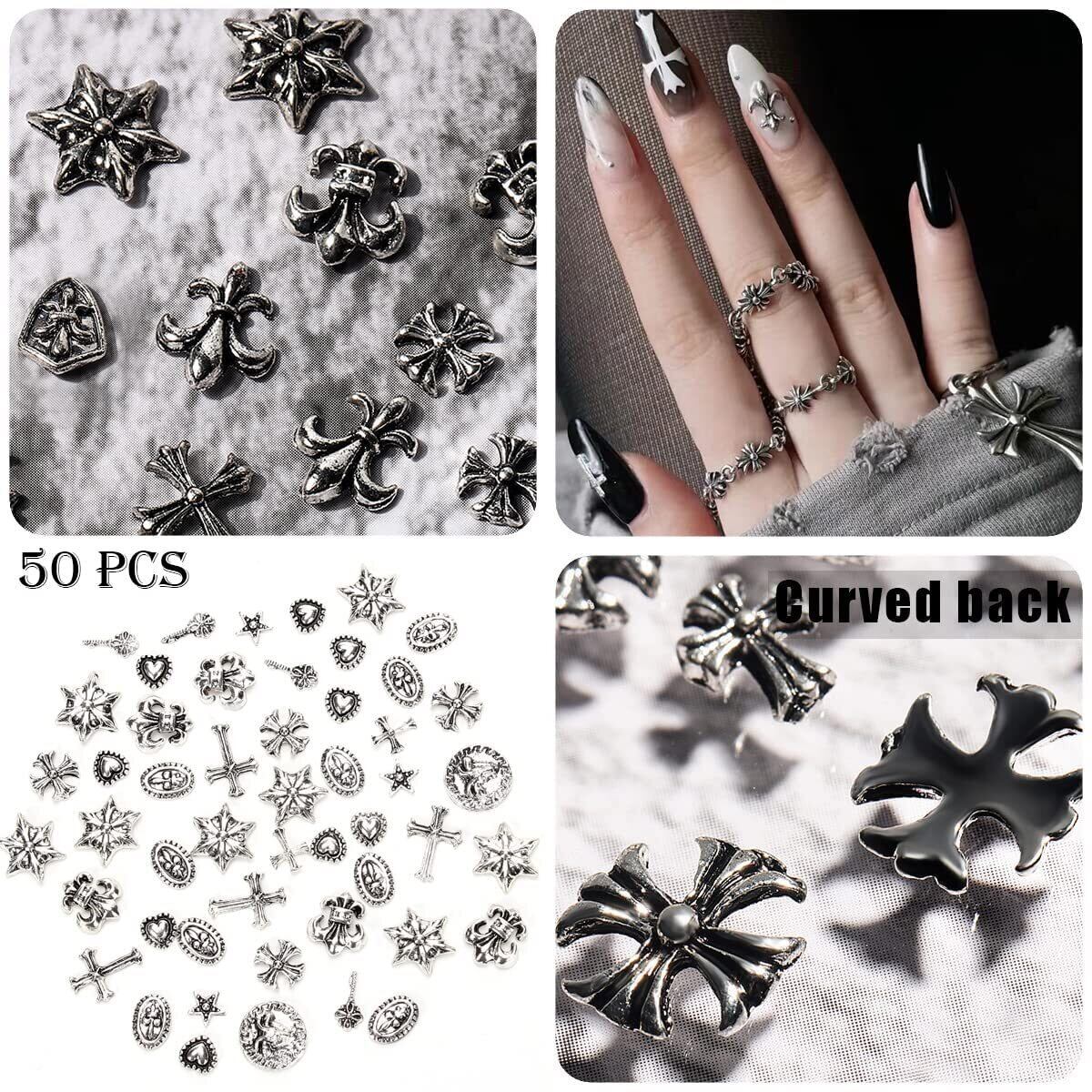 50個のパンクネイルアートチャームヴィンテージシルバ 3D クロス ネイル チャーム ヴィンテージ メタル ネイル チャーム アクセサリー パンク ネイル アート 用品 マニキュア ネイル アート クラフト DIY ネイル デコレーション (レトロ シルバー混合パック)