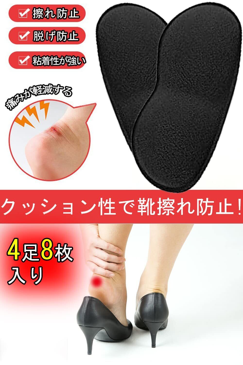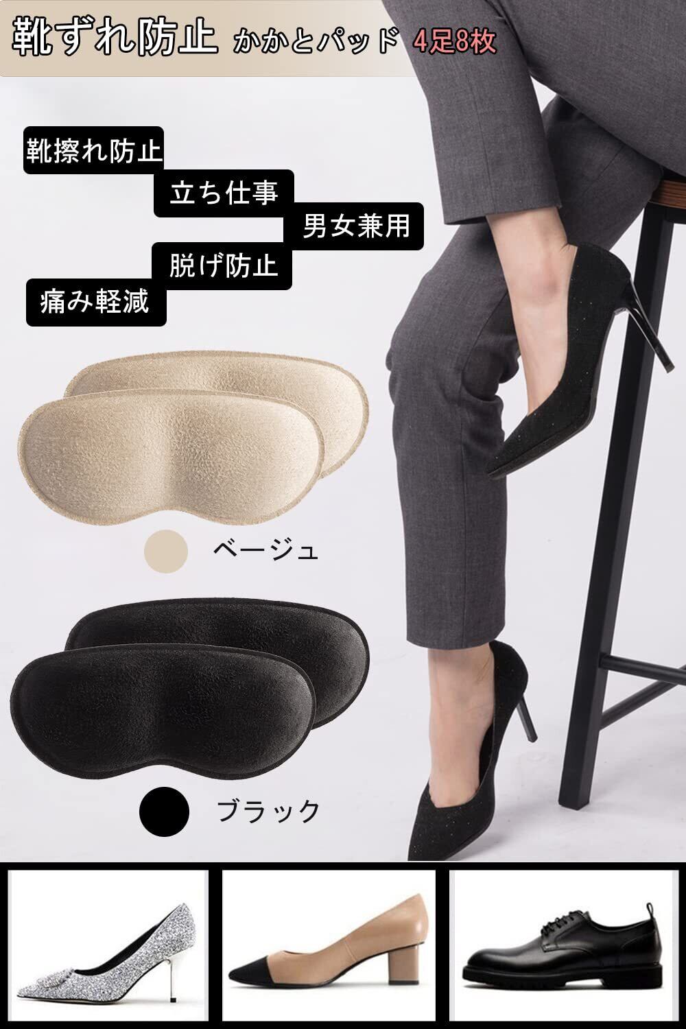 【新春セール】かかとクッション 靴擦れ防止 かかと クッション 【4足8枚入り】踵脱げ ふんわり 脱げ防止 靴擦れ サイズ調整 ハイヒール 痛み 靴に貼る 靴対応 男女兼用 サイズ調整用 (4足8枚入り, ブラック)