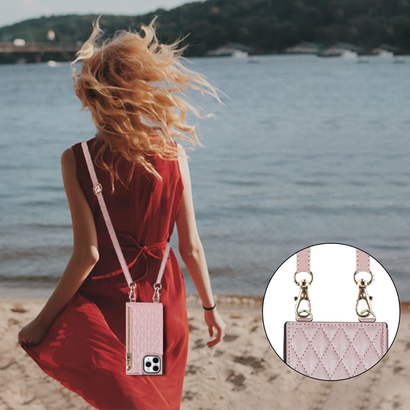【在庫処分】【Hamany】 iphone 11 pro max ケース ショルダー iphone11プロマックス ケース 手帳型 クロスボディ グリッドパターン 11promax ケース ジッパー式 ストラップ付き 刺繍 アイフォン 11 プロマックスケース 肩がけ 首掛け 斜め掛け 収納 ファスナー型 耐衝撃 レザー カバー-ローズゴールド