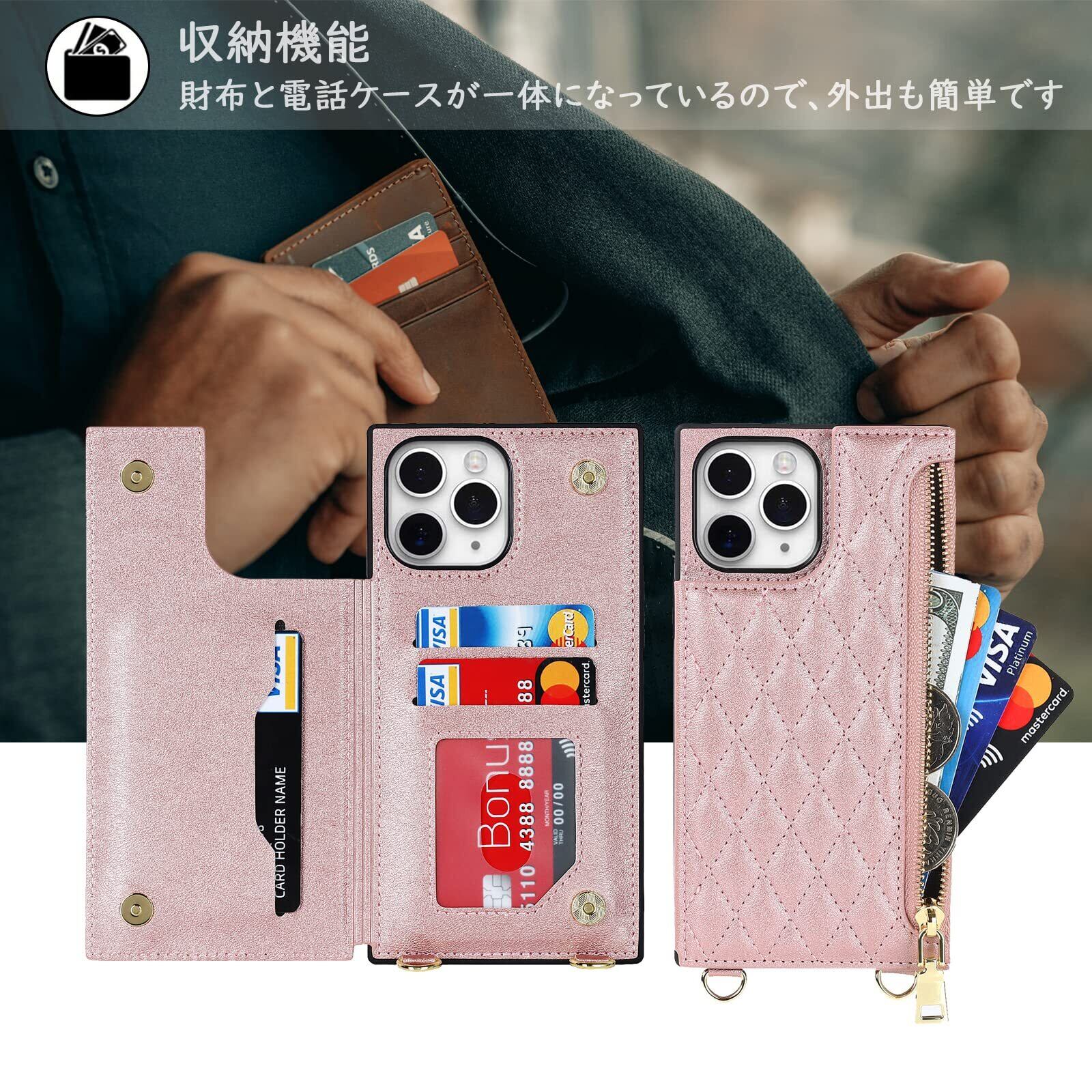 【Hamany】 iphone 11 pro max ケース ショルダー iphone11プロマックス ケース 手帳型 クロスボディ グリッドパターン 11promax ケース ジッパー式 ストラップ付き 刺繍 アイフォン 11 プロマックスケース 肩がけ 首掛け 斜め掛け 収納 ファスナー型 耐衝撃 レザー カバー-ローズゴールド