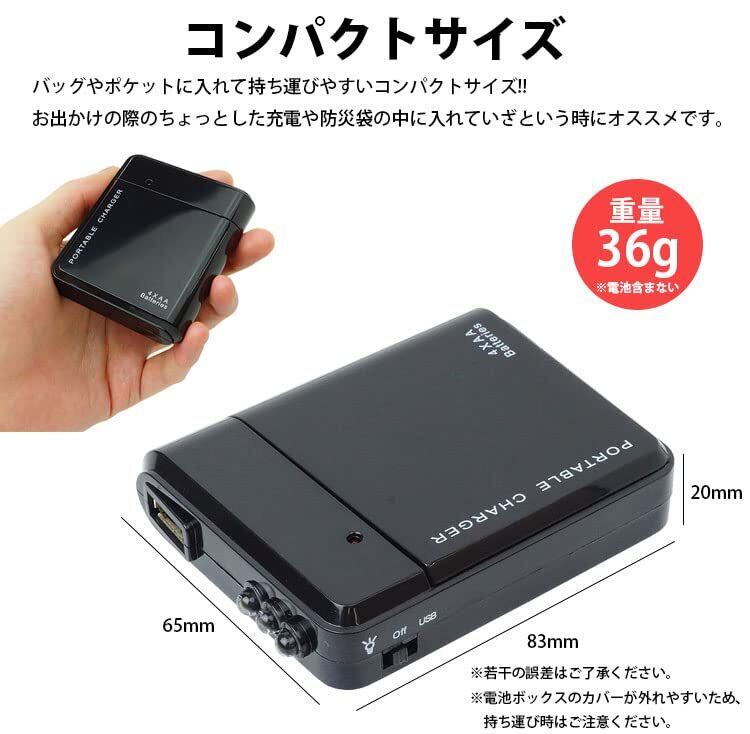 サイズ(約):65mm×83mm×20mm 使用電池:単3形電池 4本 (別売り)※乾電池またはニッケル水素充電池 USB出力:DC 5V-4V 最大 0.7A※電池残量が減少すると出力は低下していきます。 材質:ABS 入数:1個 重量(約):36g (電池含まない)