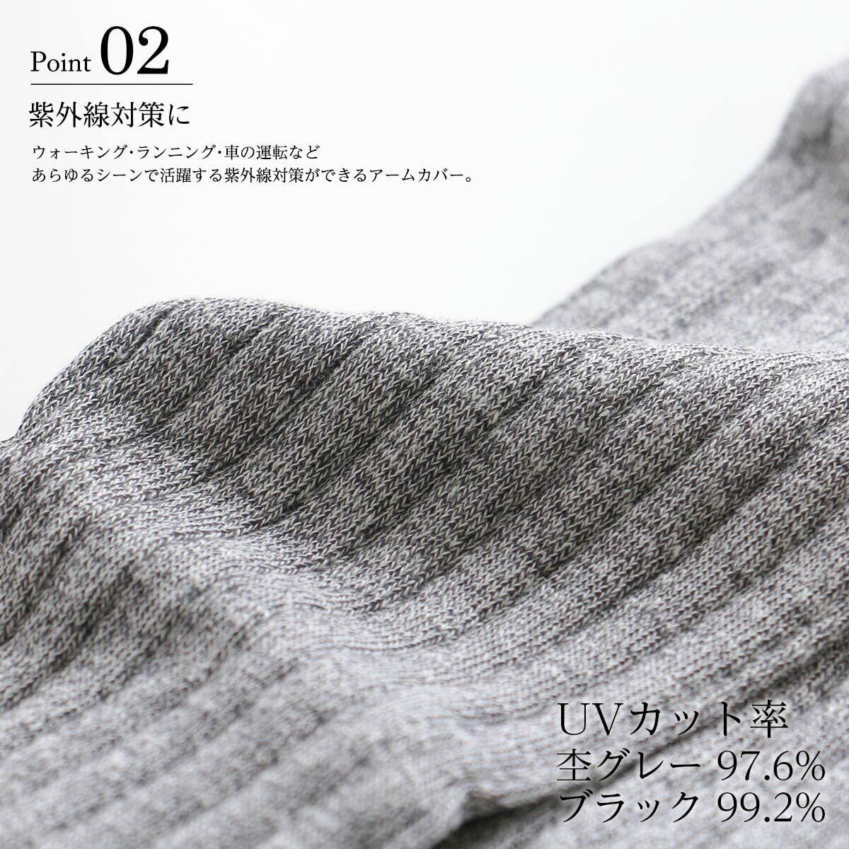仕様・その他 : ロング丈 48cm(使いやすい筒型タイプ)、リブ編み UVカット(UVカット率:杢グレー97.6%、ブラック99.2%) 軽量/速乾