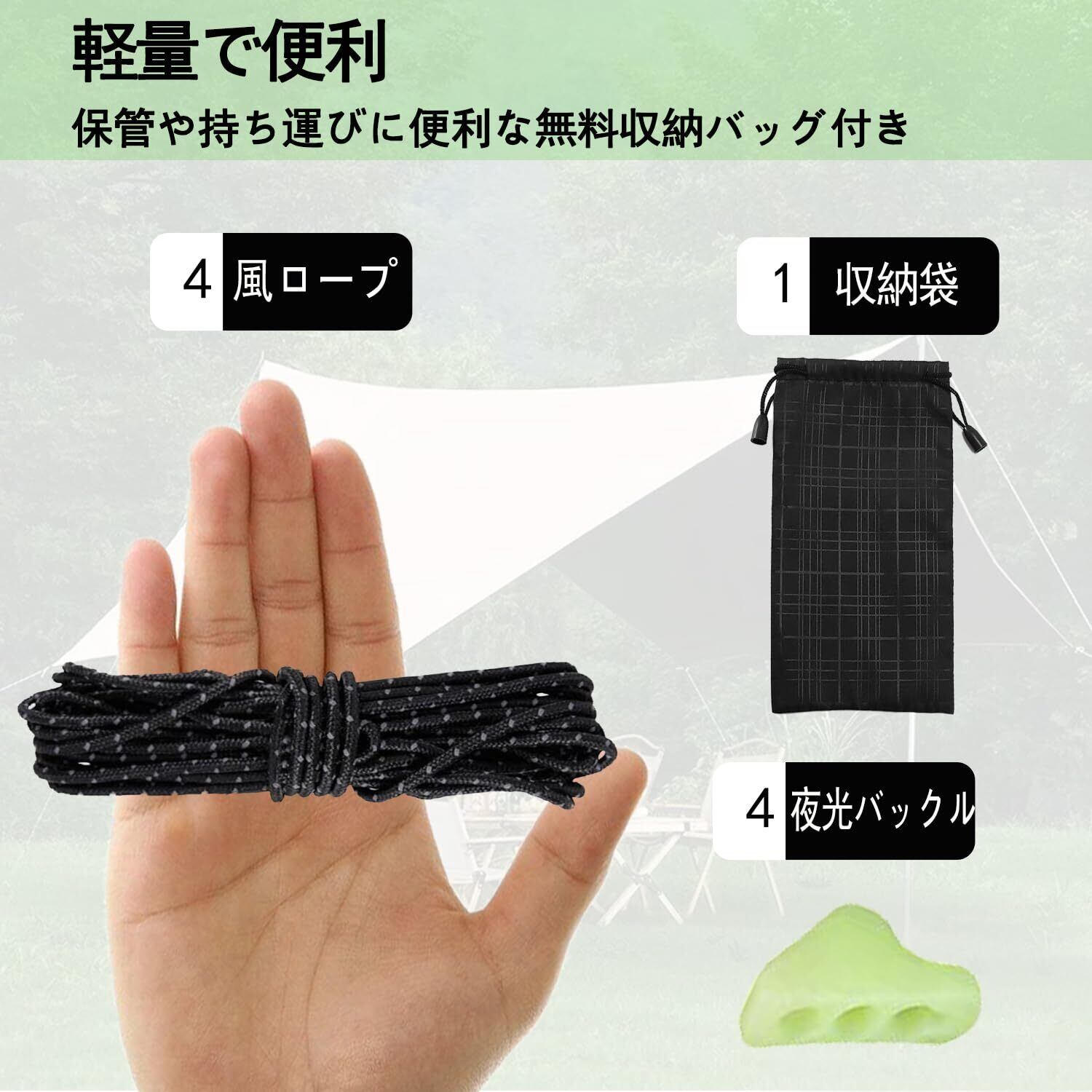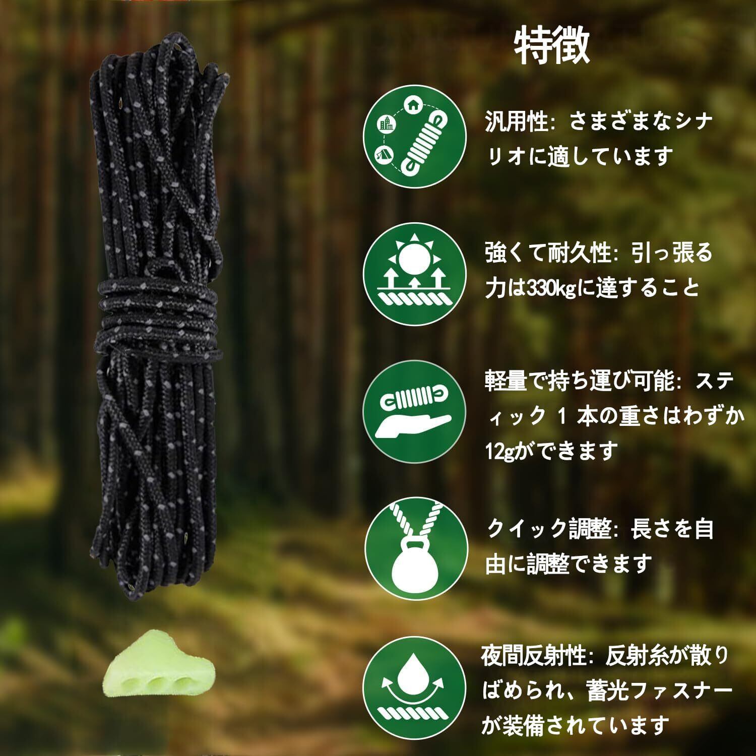 反射材入りで視認性アップ: 反射材が組み込まれており、ライトに反射して視認性が向上。夜間の転倒防止やテントの目印としても役立ち、アウトドアシーンで安心感を提供します。