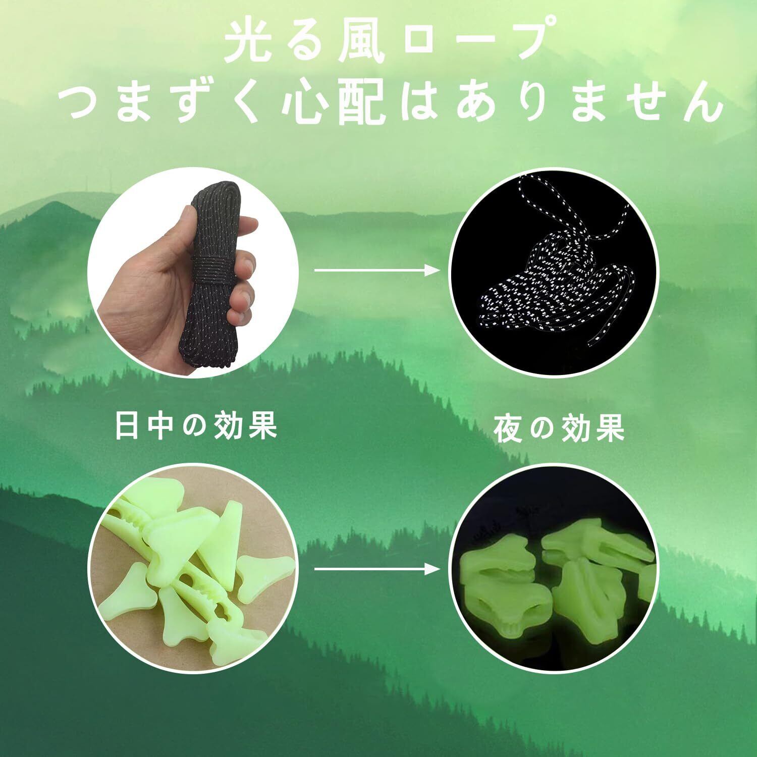 蓄光自在金具で夜間も安心: 蓄光自在金具が付いており、太陽光やLEDライトで充電後、夜間に光ります。暗い場所でもロープの長さを簡単に調整でき、使い勝手抜群です。