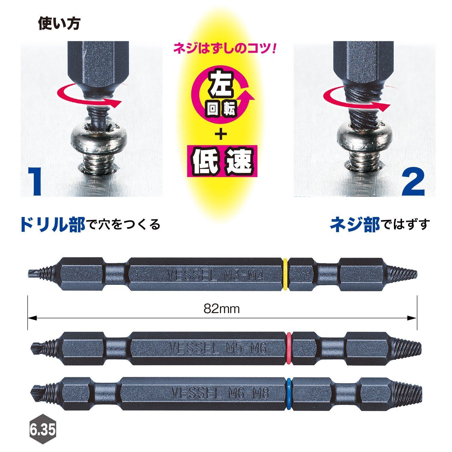 使い方1:ドリル部で対象ネジに穴をつくります。使い方2:穴あけ後の切削粉をそうじします。使い方3:ビットを差し替えて、ネジ部をドリル部であけた穴に入れ回転させ、ネジを外します。