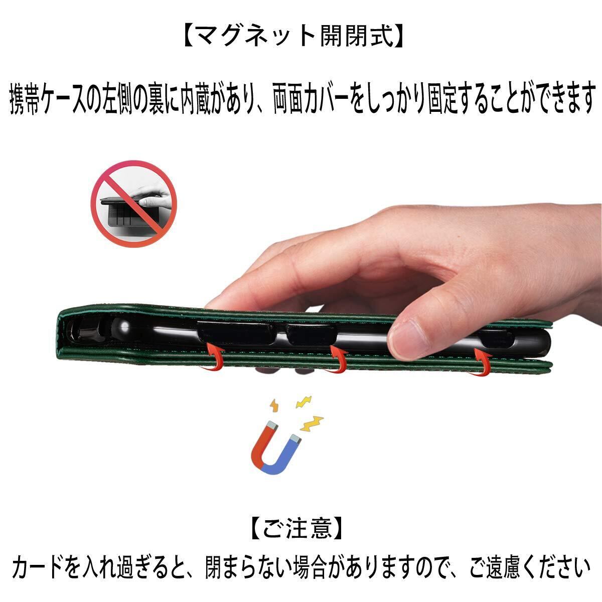 【カードポケット付き】:財布型ケースとして、名刺やお札などを入れるカードポケットがつき、ちょっとしたお出かけにもスマホケース一つでOK!日常生活に便利です。ただし、カードを入れ過ぎると、閉まらない場合がありますので、ご遠慮ください。
