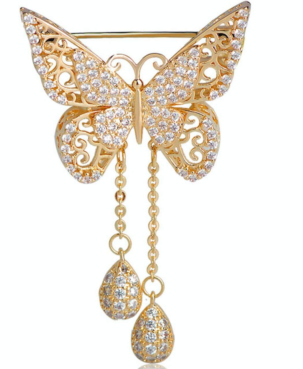 蝶々のエレガントな高級感あふれるキュービックジルコニア のブローチです。 丁寧な造りで細かな部分まで凝っています。 サイドから見ても立体的なフィリグリー細工が美しいです。 下のチェーンが揺れるダングルタイプですので、 よりキュートな雰囲気が感じられます。 インスタ映え、ギフトにも! ■キュービックジルコニア 、高品質メッキ合金仕上げ ■5㎝×3㎝ ■ベルベット調ポーチ付き