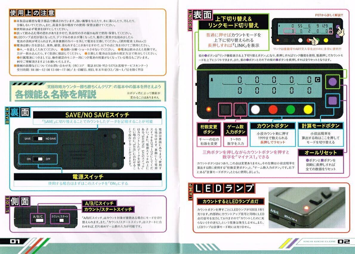 ●大きくて見やすい液晶表示。●Wディスプレイ。●リンク機能。●LED機能。●押しっぱなしのいらないON/OFF式合算出現率表示。