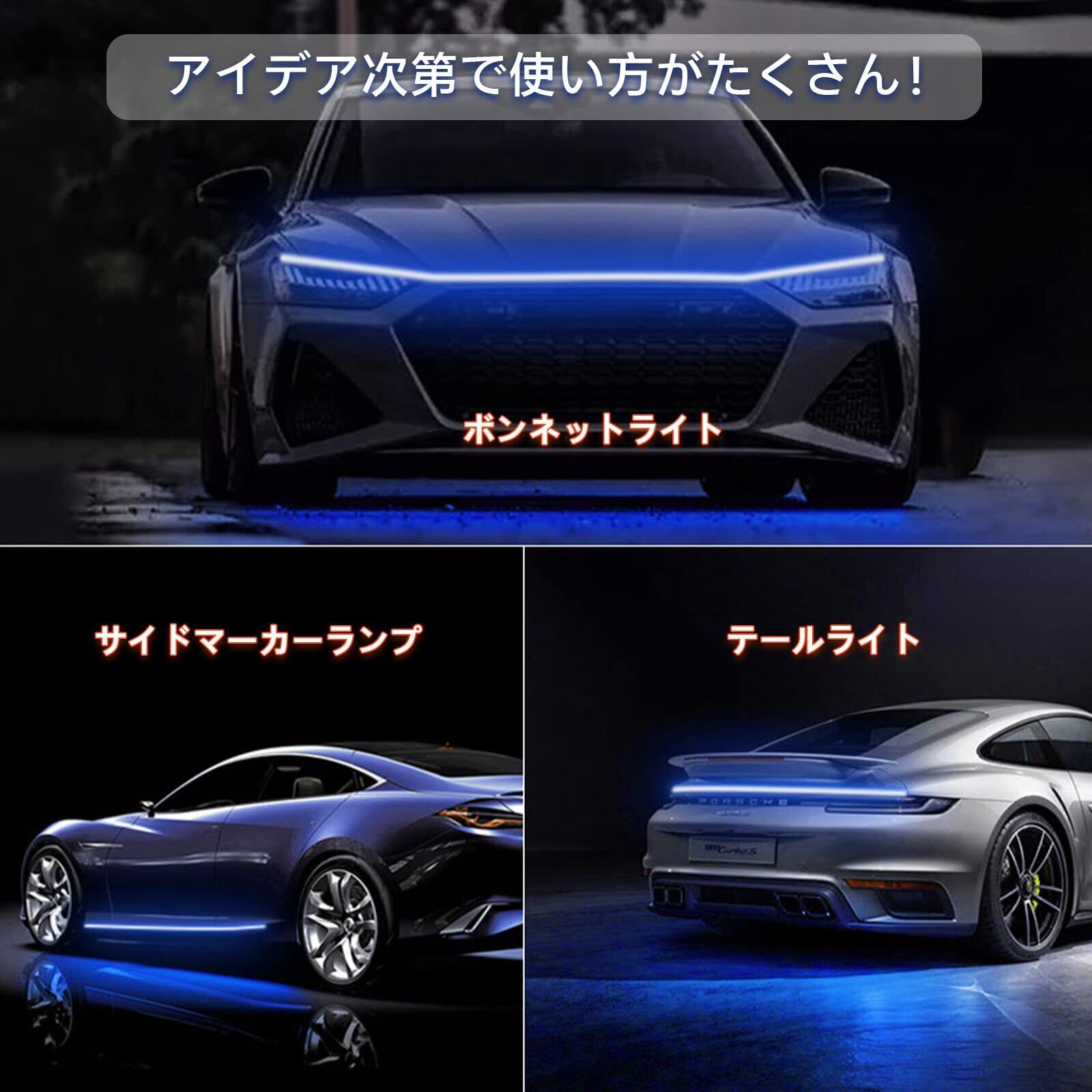 【機能抜群】ご愛車の電源を入れたばかりの時に、LEDテープライトはご車の主人を歓迎しているようです。LEDが流れるように光った後に、常に点灯になります。フードライトストリップとして、華やかな光が車のヘッドに綺麗に光って、抜群にインパクトをアップさせて、運転の安全性を向上させて、運転者の気分も向上させました。