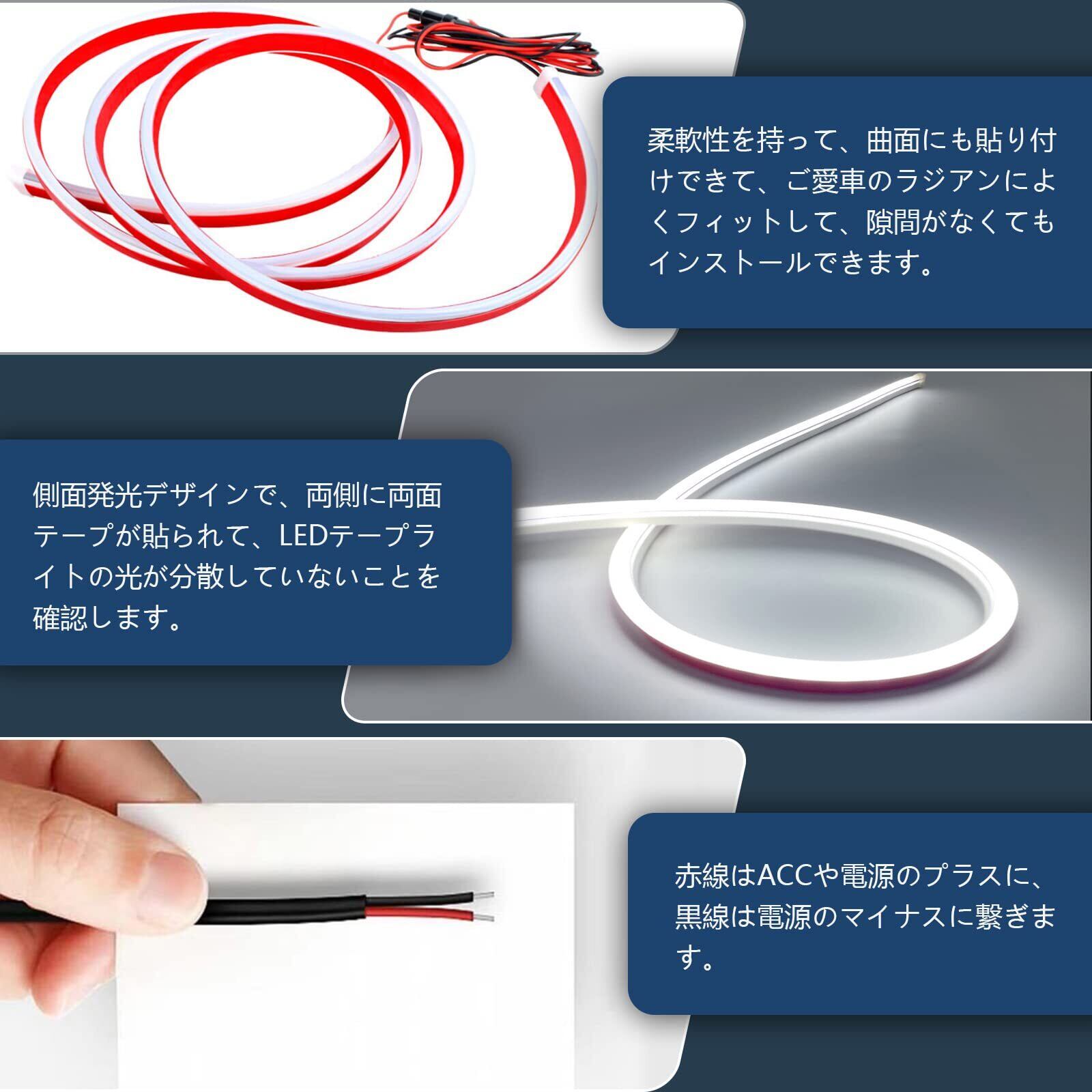 【取付簡単&多用途】極薄型デザインで、隙間なく設置できて、取付け位置を確認後に両面テープを剥がして固定するだけです。DC12Vの電圧の場所で使えます。自動車、SUV、バン及びにトラックなどのにテープライト、ディライト、ボンネットライト、車装飾ライト、車のドア ライト、ペダルライト、ボートライトストリップなどとして最適です。アイデア次第で使い方がたくさん!