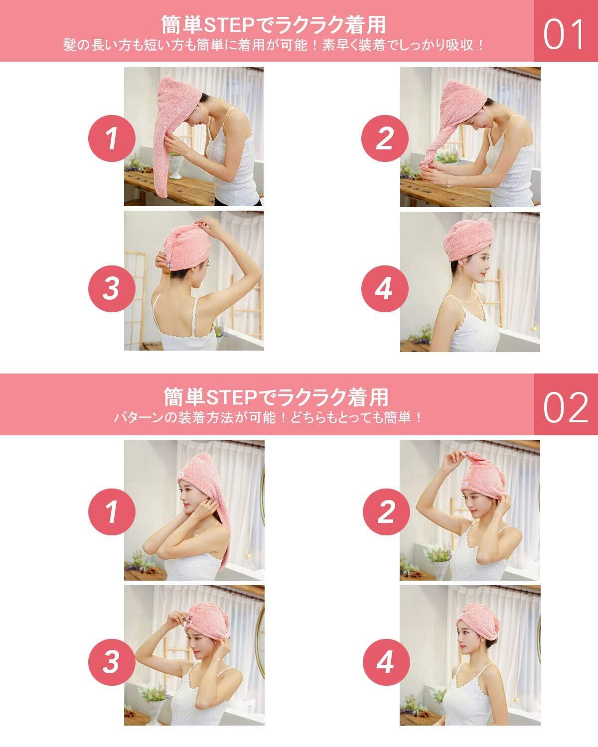 【特別なデザイン】ドライキャップがボタン付きなので、髪を包んだまま用事をしても落ちられません。風呂上がりとき、服を濡らすことが心配しないでください。シャワーキャップの構造が人性デザインですが、装着が簡単ですが、2種類があります。後ろ留め 1.髪の毛を包んで前に伸ばす 2.数回ねじって3.後ろでボタンを留めます。 前留め(ショートヘアはこっち)1.後ろで髪を包んで伸ばす 2.数回ねじって 3.前でボタンを留めます。