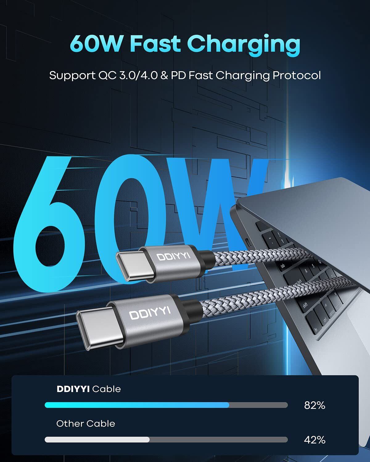 【60W高速充電を実現】DDIYYIのusb-c ケーブルはUSB Power Delivery技術に対応し、最大60Wの高速充電を対応可能。USB-Cポートからスマートフォンやタブレット端末、ノートPC等のUSB C機器にフルスピード充電が可能です。▲充電器と接続する機器がPD対応している場合に限ります。