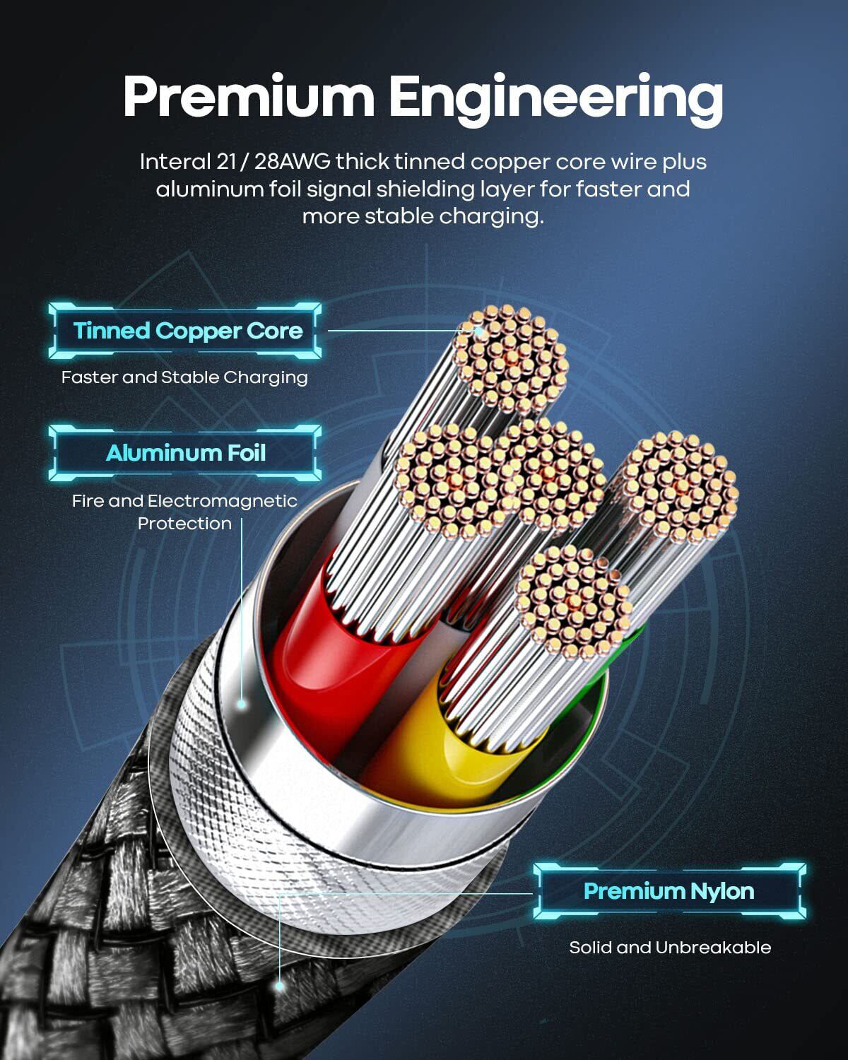 【より安全信頼】56KΩのプルアップレジスターを採用してpd ケーブル内部の抵抗を最小化ので、過電圧、過熱、過電流、ショート防止等の多重保護を提供します。定性の高い急速充電とデバイスの損傷防止を実現し、ケーブルの安全性と信頼性も向上させます。