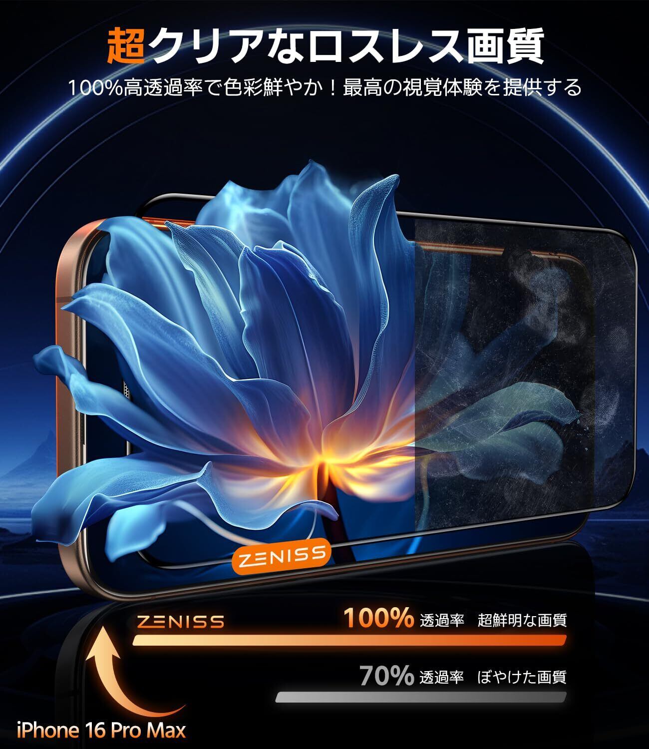 【超クリアなロスレス画質&健康を全面的に守る】このiPhone 16 Pro max フィルムは、新しくアップグレードされた高透過率素材を採用し、100%高透光率、スマホ画面のオリジナルの高精細な画質を再現、超クリアな視覚体験を提供しますまた、弊社のいphone16 Pro maxガラスフィルムは、国際認証のブルーライト防止テストと抗菌テストをクリアしていますガラスフィルム表面のAnti-Reflective/Anti-Blue Lightコーティングにより、ブルーライトを100%カットし、長時間や夜間にスマホを使用する際、ブルーライトが視網膜に与える潜在的なダメージを防ぎます 目を大切にさらに、最新のナノ抗菌技術を採用し、表面に付着する99.9%の細菌を強力に抑制しますお子様も安心して触れることができ、あなたとご家族の健康を全面的に守ります