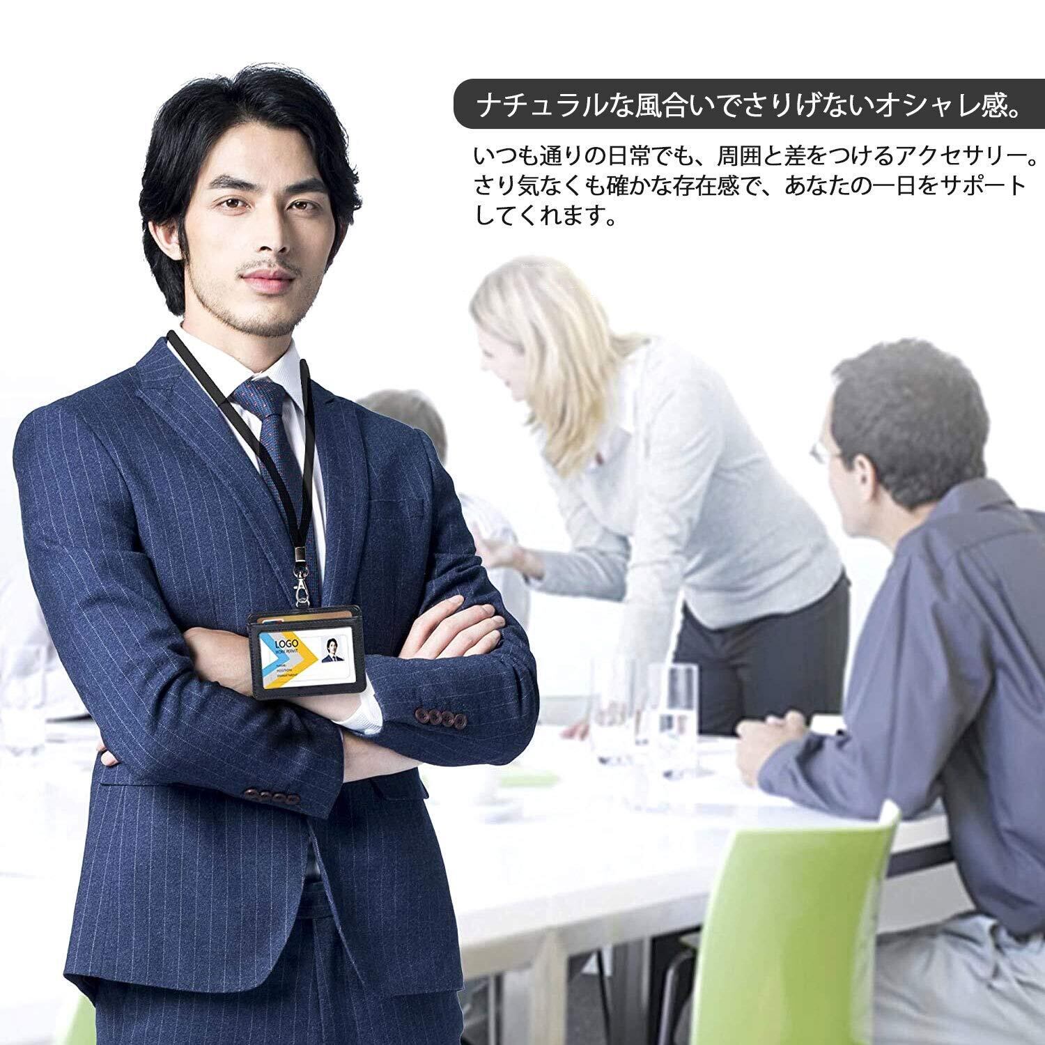 【仕様紹介】表面に透明ポケットの部分が傷がつきにくい素材で作られており、裏面にもポケットがついています。正面に社員証や名札などを入れ、裏面にSuica、クレジットカードや名刺が入るから実用的。身分証と名刺の組み合わせはビジネスパーソンには必須。