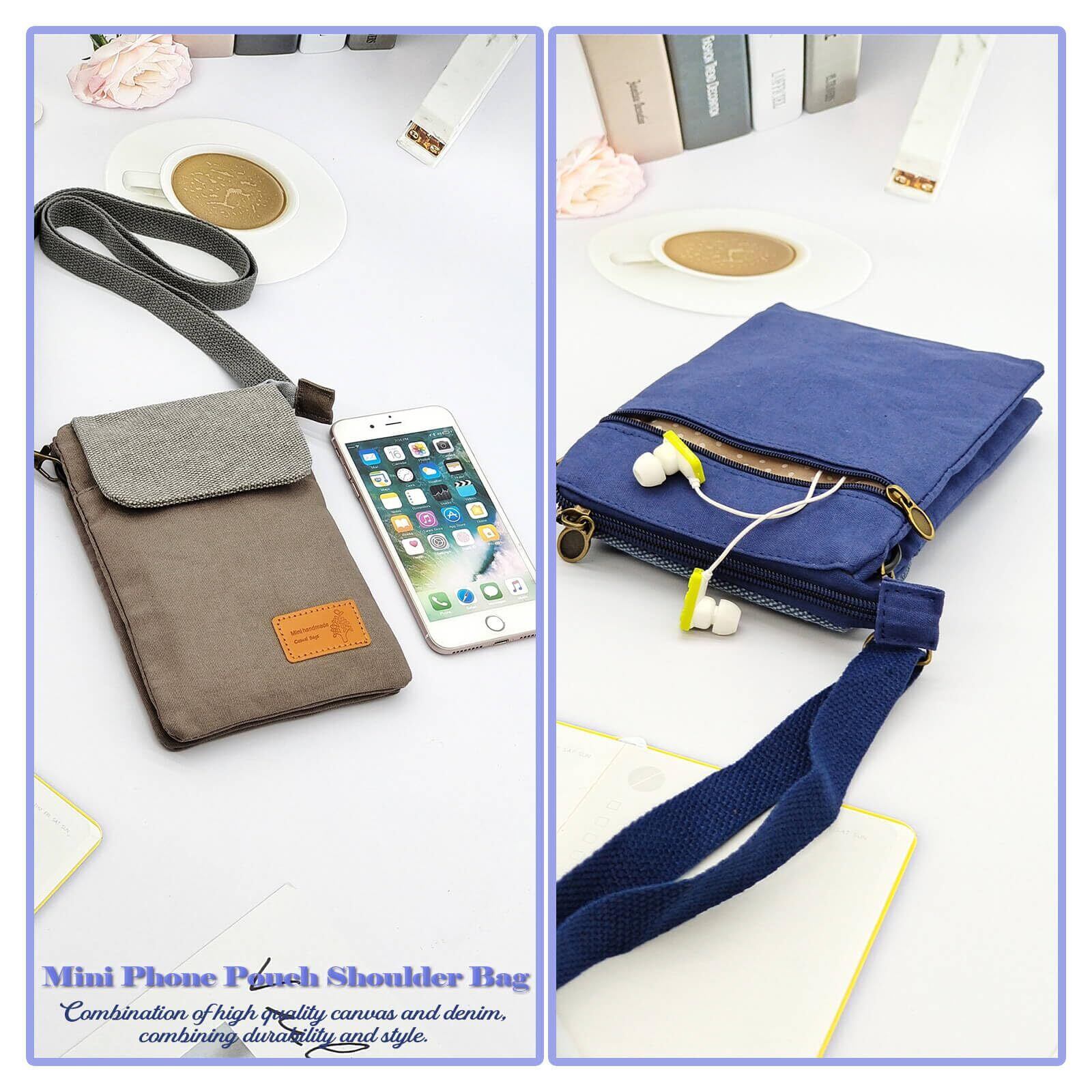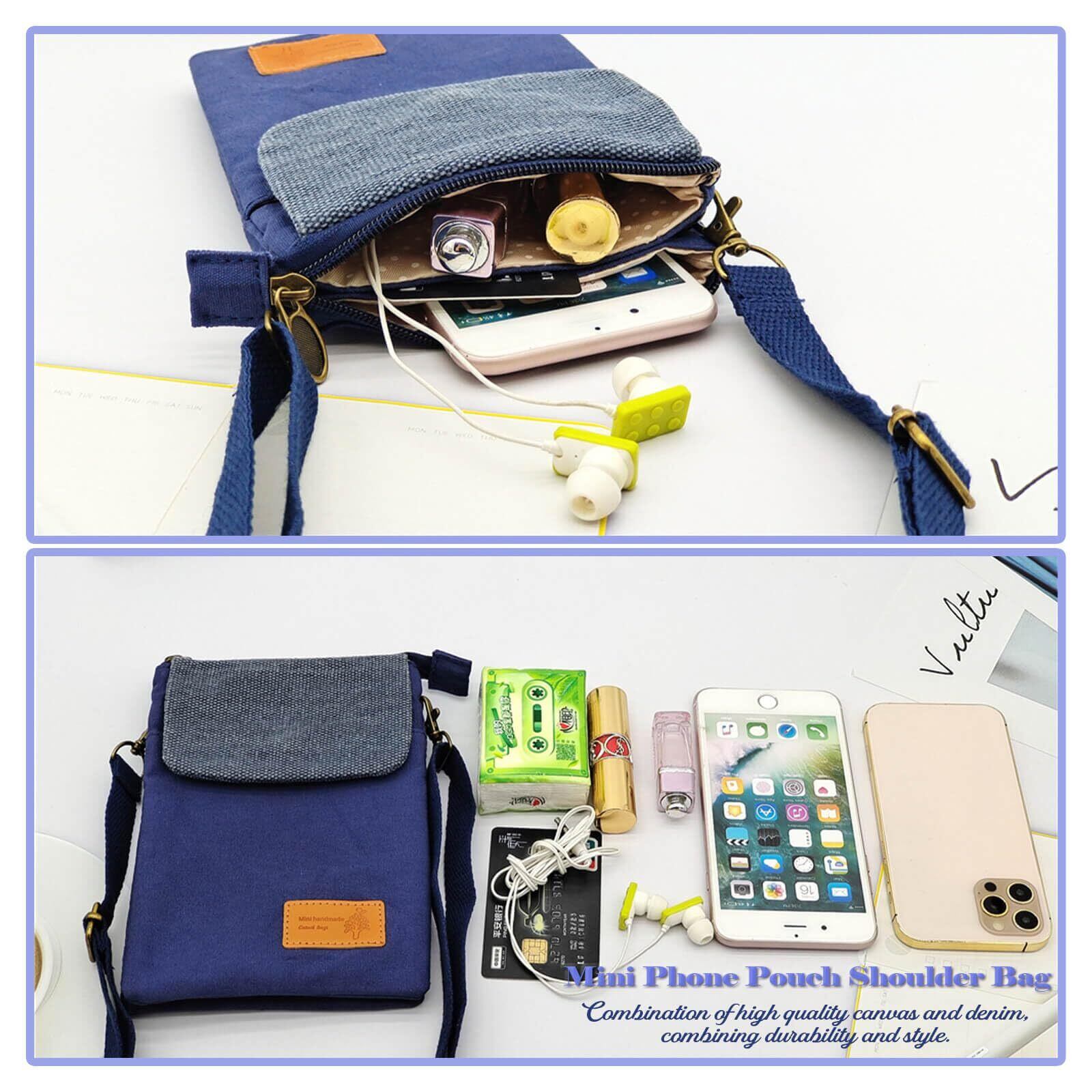 サイズ: 横19.5cm×高さ13cm×幅2cm、重量:約120g。素材:高品質帆布とデニムを組み合わせ、耐久性とスタイルを兼ね備えています。このショルダー スマホポーチは、特にレディース向けにデザインされています。