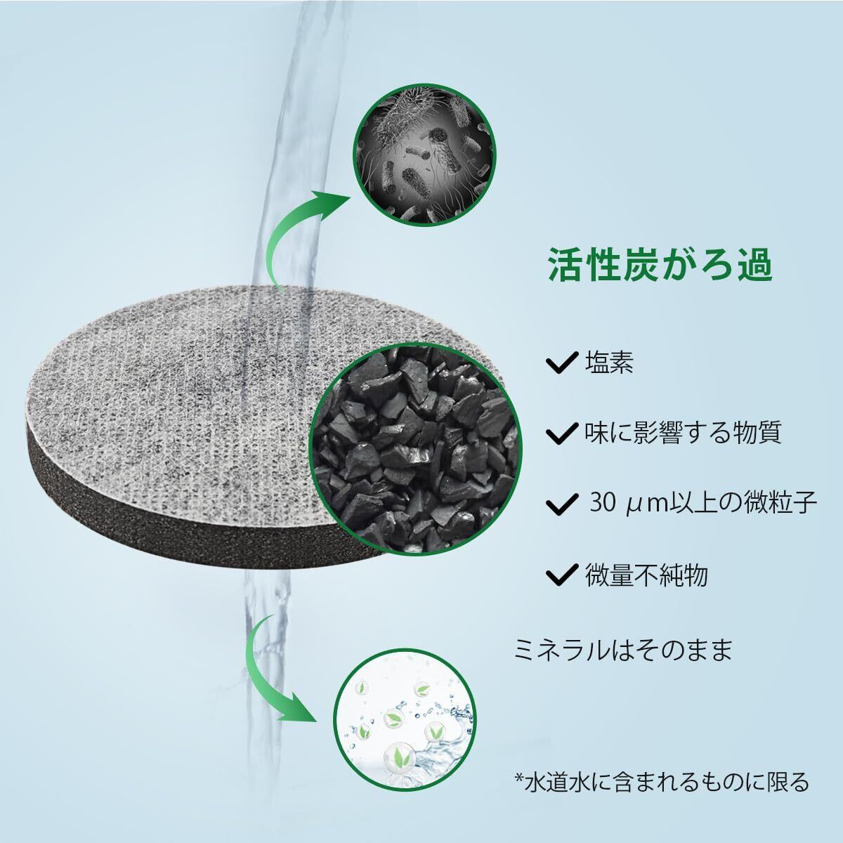 【安心の材質】新鮮でおいしい水をヤシ殻から製造された天然活性炭が以下をろ過します:√塩素および味に影響するその他の物質。√殺虫剤、除草剤、環境ホルモンなどの微量不純物。√30um以上の微粒子。
