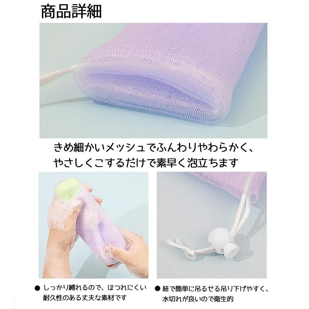 1.【ソフトで耐久性のある素材】柔らかく耐久性のある高品質のポリエチレン素材で作られています。 優しい素材が豊かな泡立ちを作り出し、シャワーの使い心地を良くし、入浴をより楽しくします。 2.【サイズぴったり】各バブルスポンジメッシュソープバッグのサイズは約17 x 8 cmで、ほとんどの石鹸を快適に収納できる十分な広さがあります。 広々としたデザインなので、ソープがバッグの中を自由に動き回り、豊かな泡立ちでしっかりと汚れを落とします。 3.【効果的な石鹸の保護】石鹸をソープバッグプロテクターに入れ、巾着をしっかりと引っ張ることで、石鹸は効果的に落下やカビから保護されます。 また、付属の吊り下げ用ループを使えば、ソープバッグを壁に掛けて素早く乾燥させることができます。 この実用的なデザインは、石鹸を保護するだけでなく、バスルームを整頓することもできます。 4.【便利な量】 紫色のメッシュソープバッグを2つお届けします。 自分用にも、家族や友人とシェアするのにも十分な量です。 いつも清潔なソープバッグを手元に置いておける、お得なセットです。 5.【多用途に使用可能】発泡メッシュのソープバッグは、手作りソープだけでなく、洗顔ソープ、メイクアップソープ、フルーツソープ、エッセンシャルオイルソープなどにも適しています。 その多用途性により、様々な洗浄ニーズに対応する多目的ツールです。 角質を落としたいときにも、豊かな泡立ちを作りたいときにも、このメッシュソープバッグは最適です。