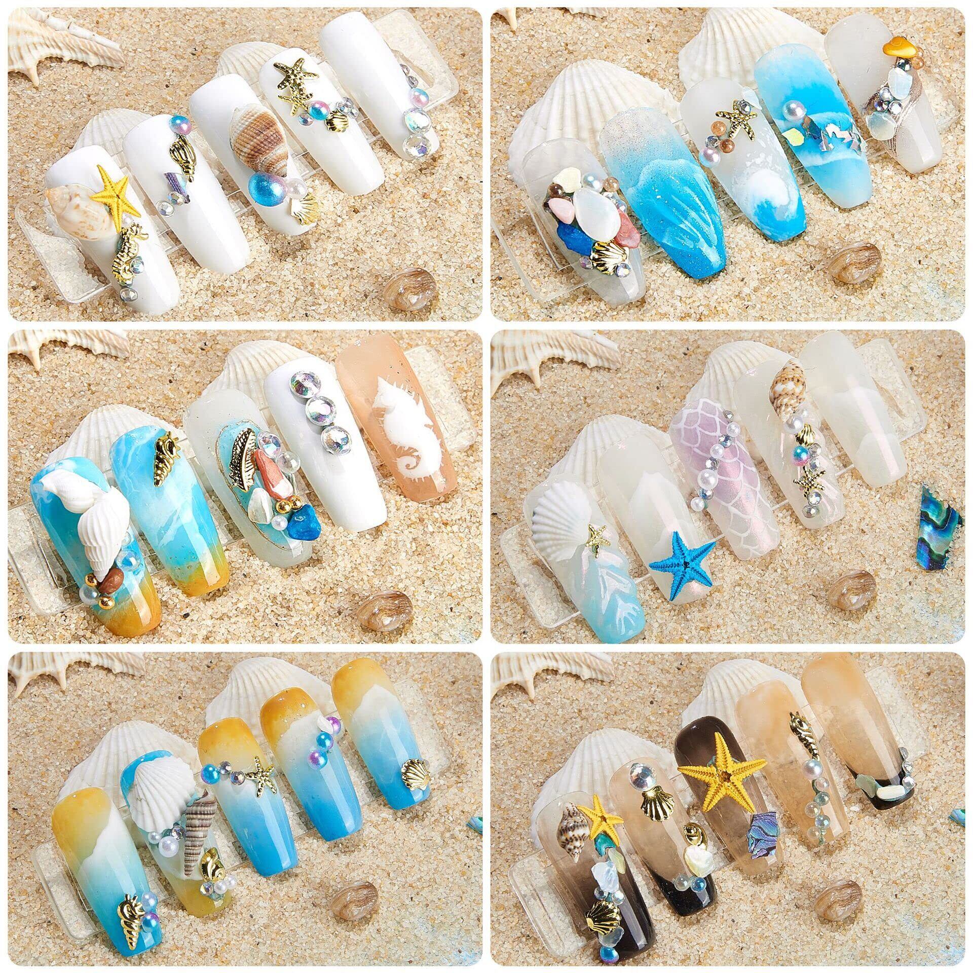 ユニークな夏のネイルアートラインストーンデザイン、巻き貝、シェル、ヒトデ、ビーズ、スタイリッシュで美しい海シリーズの爪の魅力のさまざまな形状を含む、あなたの爪はより魅力的で魅力的に見えるようにします。