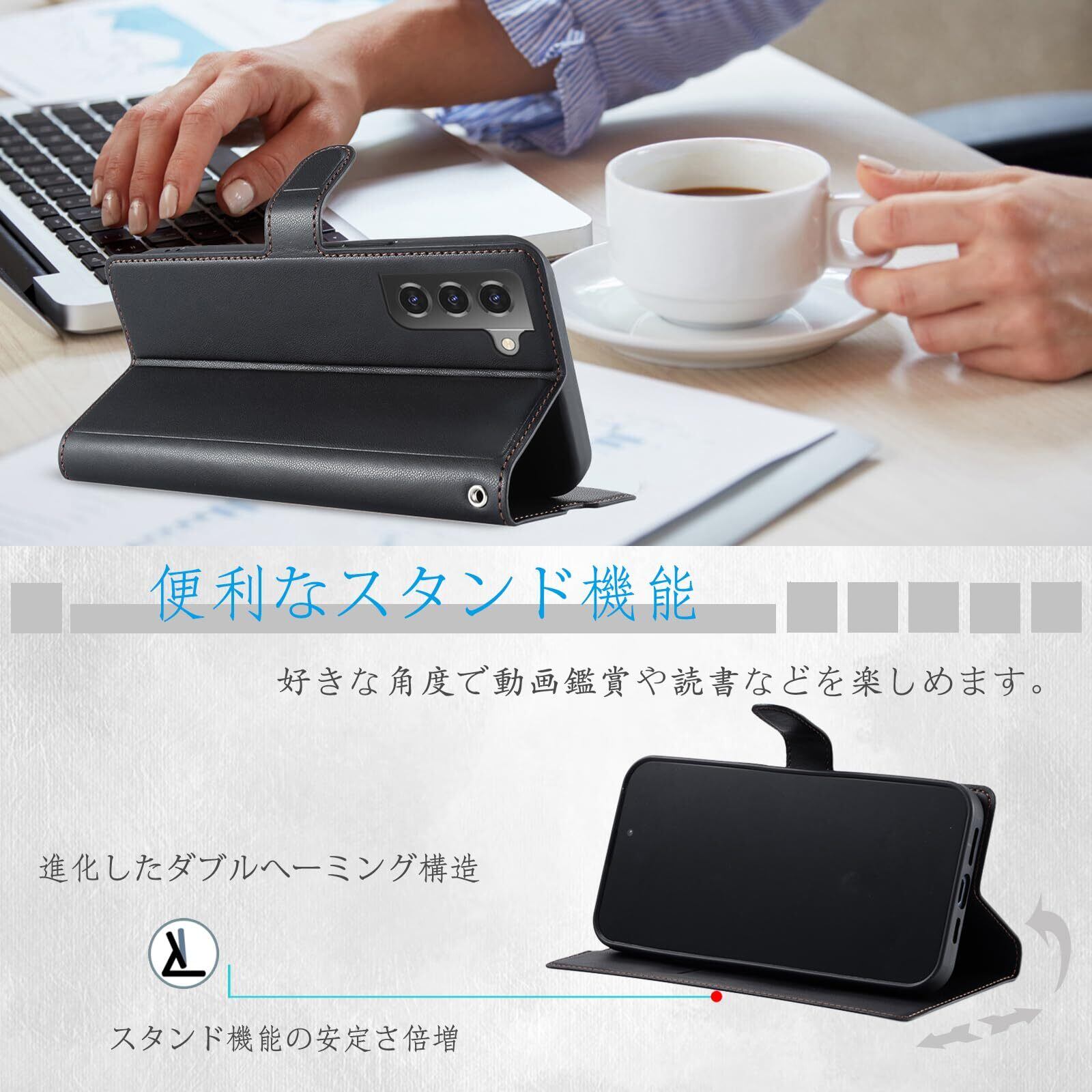 【高品質素材&全面保護】丁寧な作りとこだわりのデザインの手帳型ケースです。耐熱性と柔軟性に優れたPUレザーを使用しており、滑りにくく、指紋や油分が付きにくい仕様です。マグネット開閉機能により、簡単に開け閉めできます。手帳型ならではの全面保護機能で、ディスプレイだけでなく背面もしっかり守ります。さらに、カメラレンズ保護構造により、スマホ本体を360度傷から守ることができます。