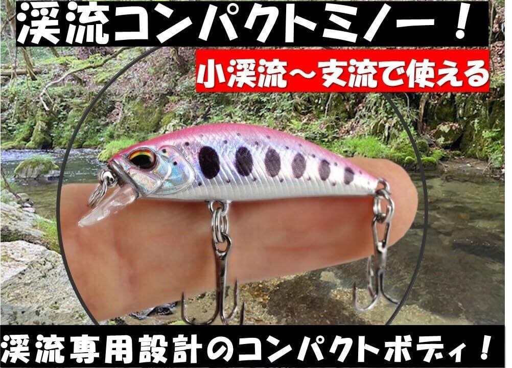 特徴:渓流専用設計コンパクトボディで、川幅の狭い小渓流でも扱いやすいトラウトミノー