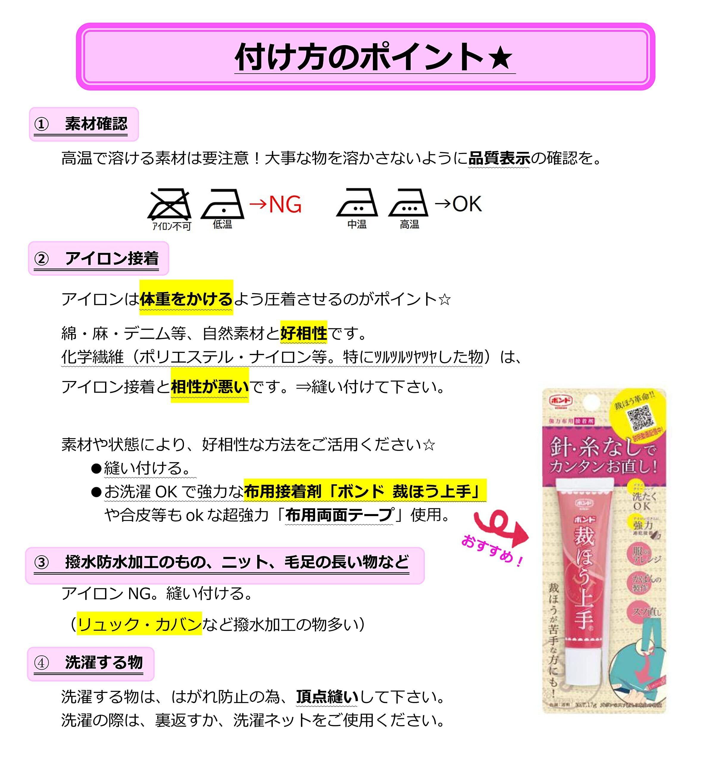 アイロン接着が可能なワッペンです。合成繊維の場合はボンドや縫い付けをお願いします。