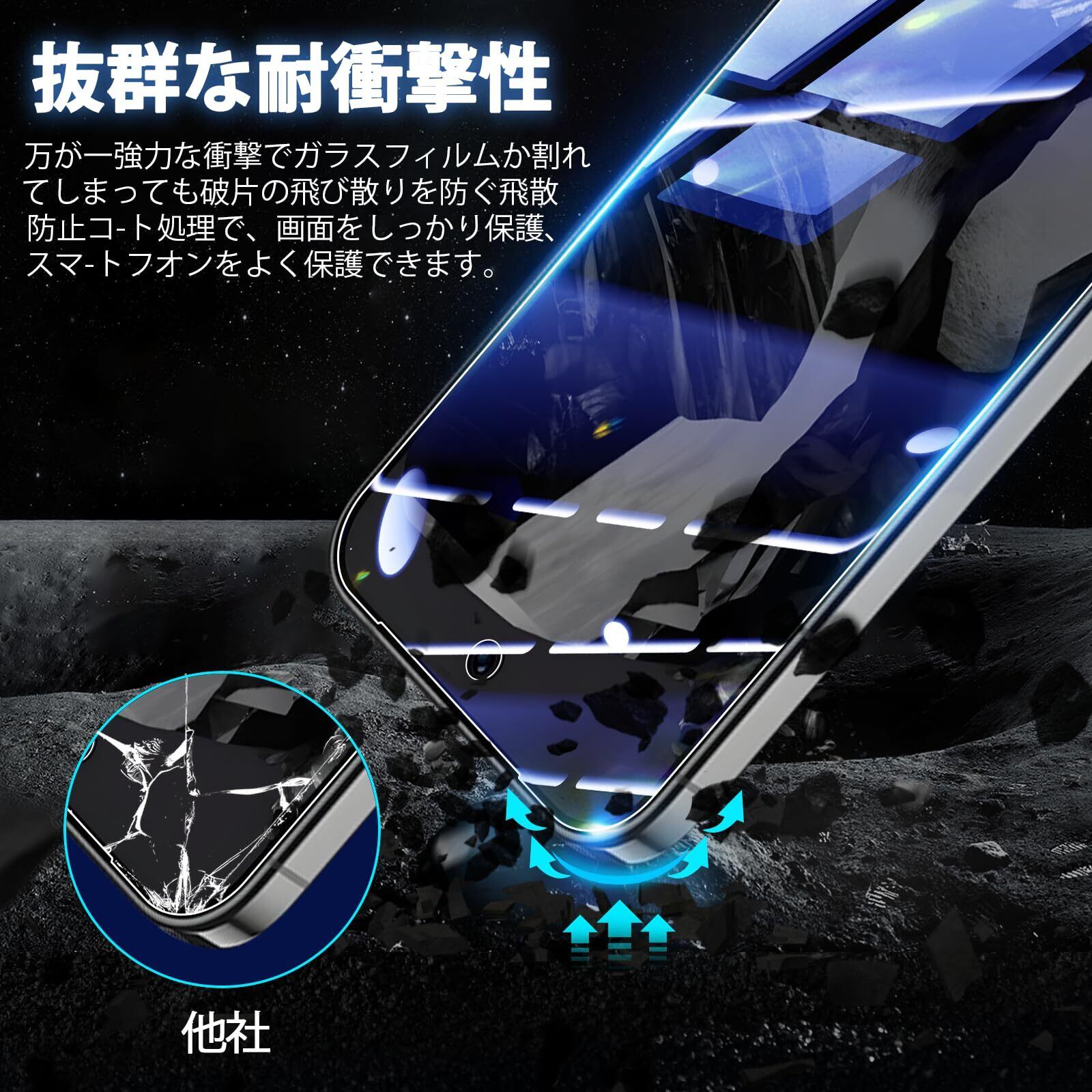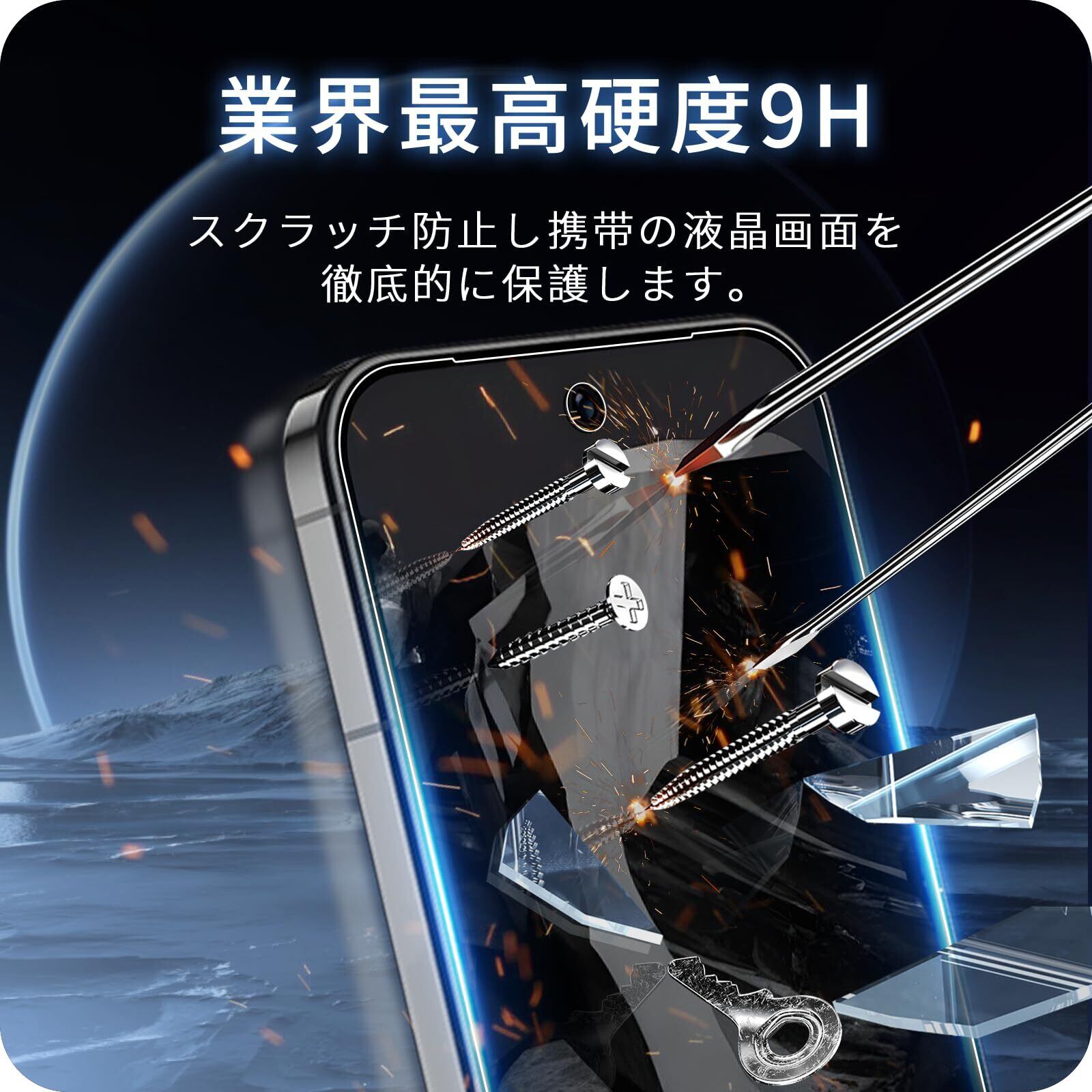 【9H硬度・飛散防止】旭硝子製ガラス素材採用 最上級強度のガラスを使用し表面硬度は9H。万が一の破損時も、飛散防止加工によって破片が飛び散ることがなく安全です。