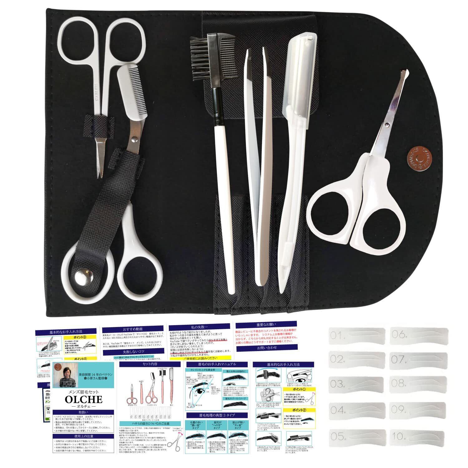 OLCHE 【メンズ美容師監修】 初心者用 眉毛 鼻毛 カット はさみ 身だしなみ セット 全19点 メンズ 眉毛カッター 顔 剃り テンプレート (10種類) コーム ハサミ 眉