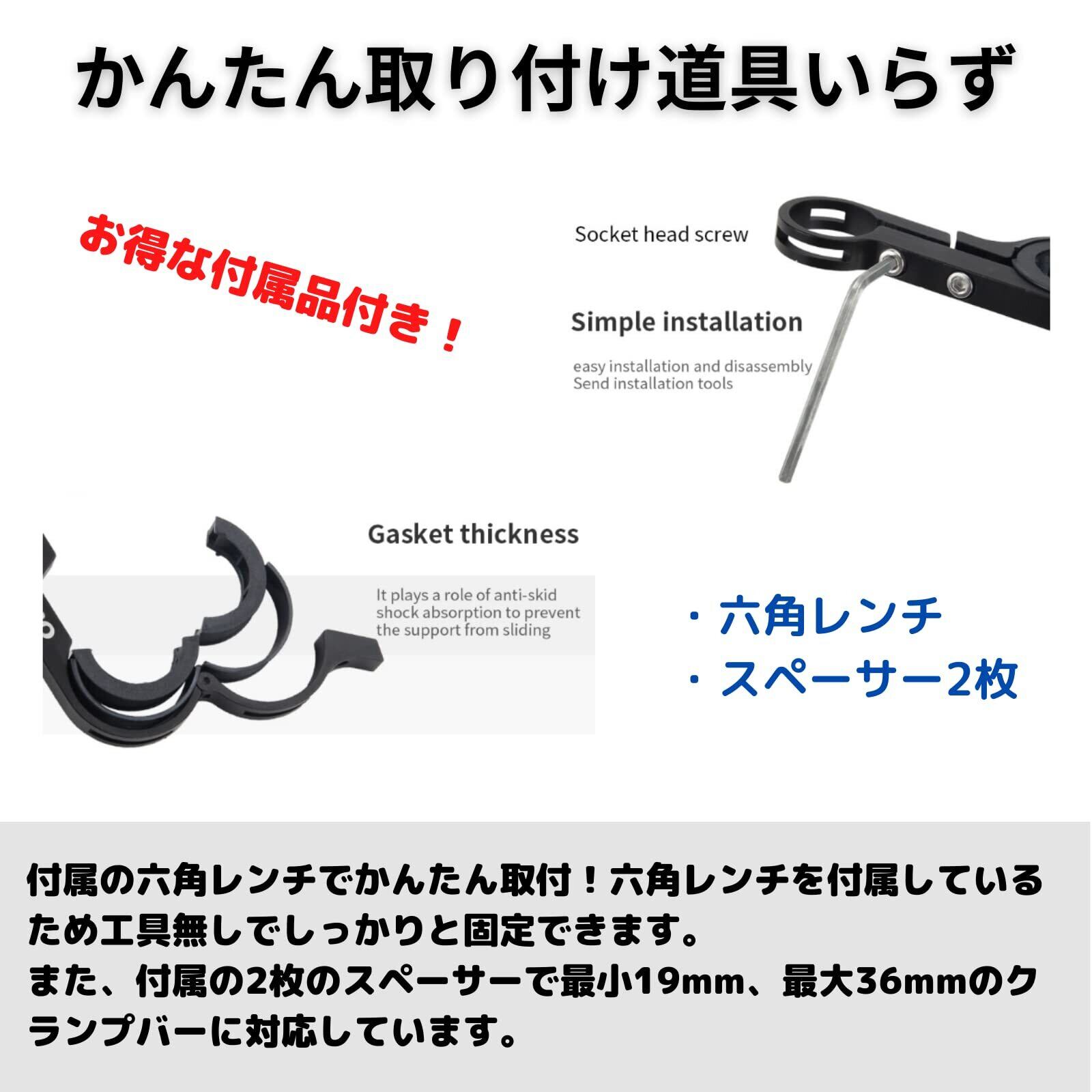 【かんたん取り付け道具いらず】六角レンチを付属しているため工具無しでしっかりと固定できます。また、付属の2枚のスペーサーで最小19mm、最大36mmのクランプバーに対応しています。