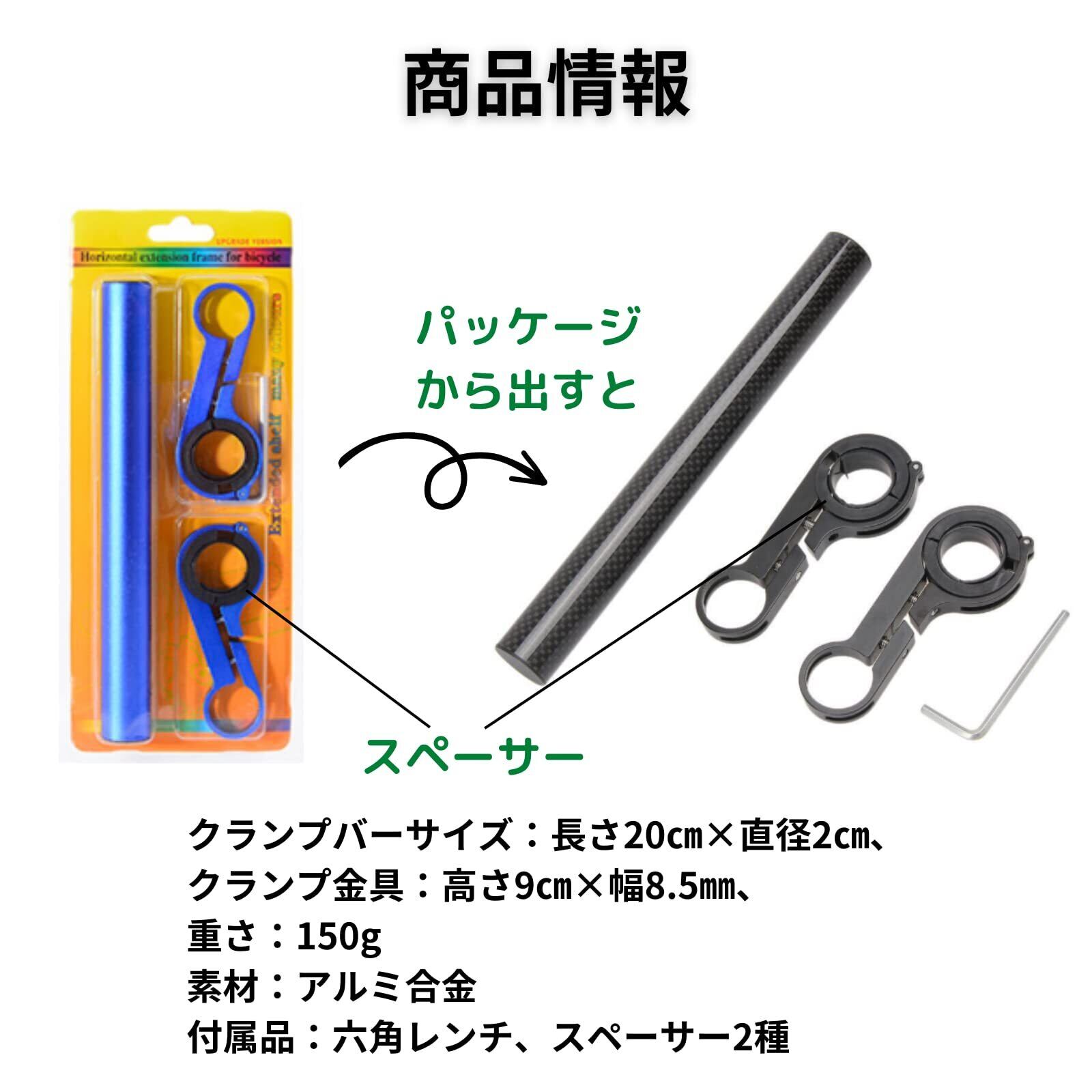 【商品情報】クランプバーサイズ:長さ20㎝×直径2㎝、クランプ金具:高さ9㎝×幅8.5㎜、重さ:150g 素材:アルミ合金 付属品:六角レンチ、スペーサー2種