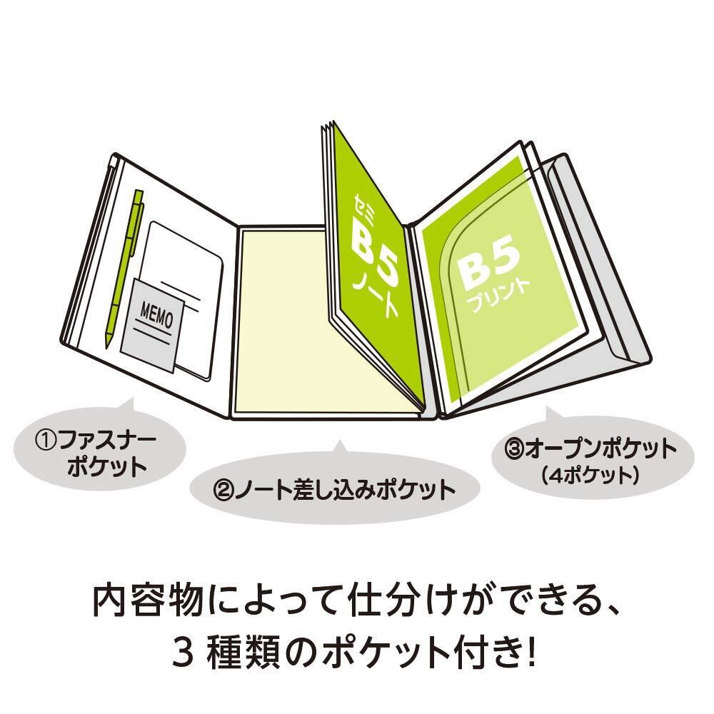 3種類のポケットで小物からA4サイズまで一冊で持ち運び可能