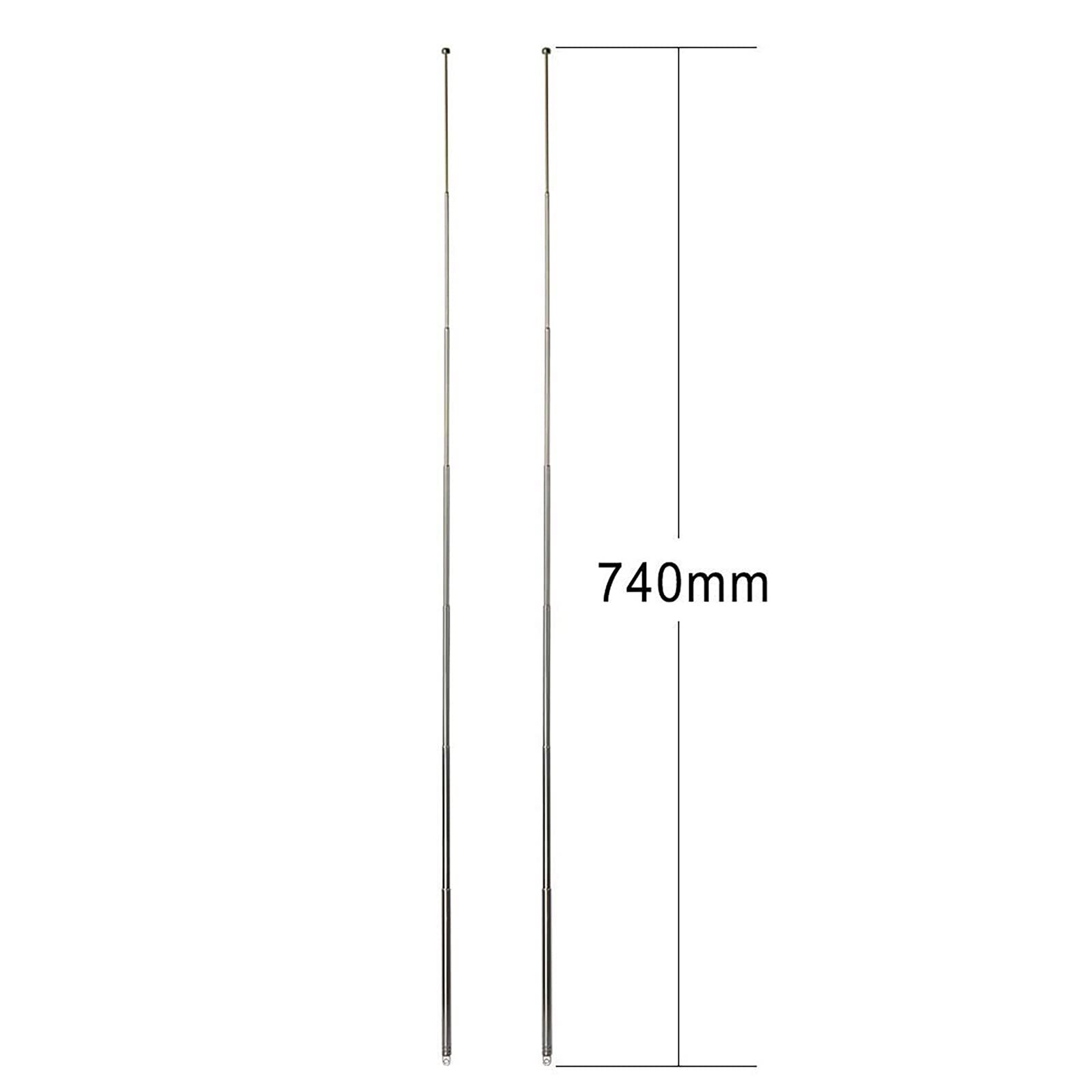 7段伸縮式アンテナ、ステンレス製、アンテナ長さ:14.7cm~74cm、取付穴径:2.5mm。