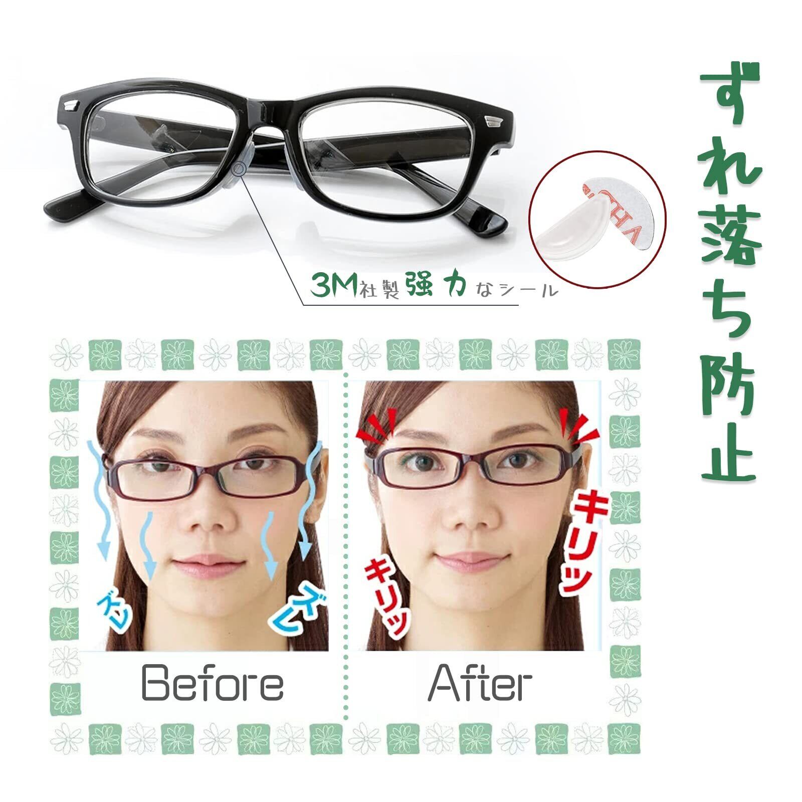 【ずれ落ち防止&メガネ跡軽減】 メガネ鼻パッドは滑り止め加工が皮脂でメガネを滑るのを防ぎます。また、メガネの鼻あてにぴったりフィットし、色素沈着を予防し、鼻に優しく良いつけ心地を体験することができます。 ●この鼻パッドは柔らかい上質なシリコン素材でできており、肌に優しくソフトに当たるので、メガネの痕や化粧くずれを防ぎます。シリコン素材でできているので、長時間の装着でも痛くなく掛け心地が快適です。