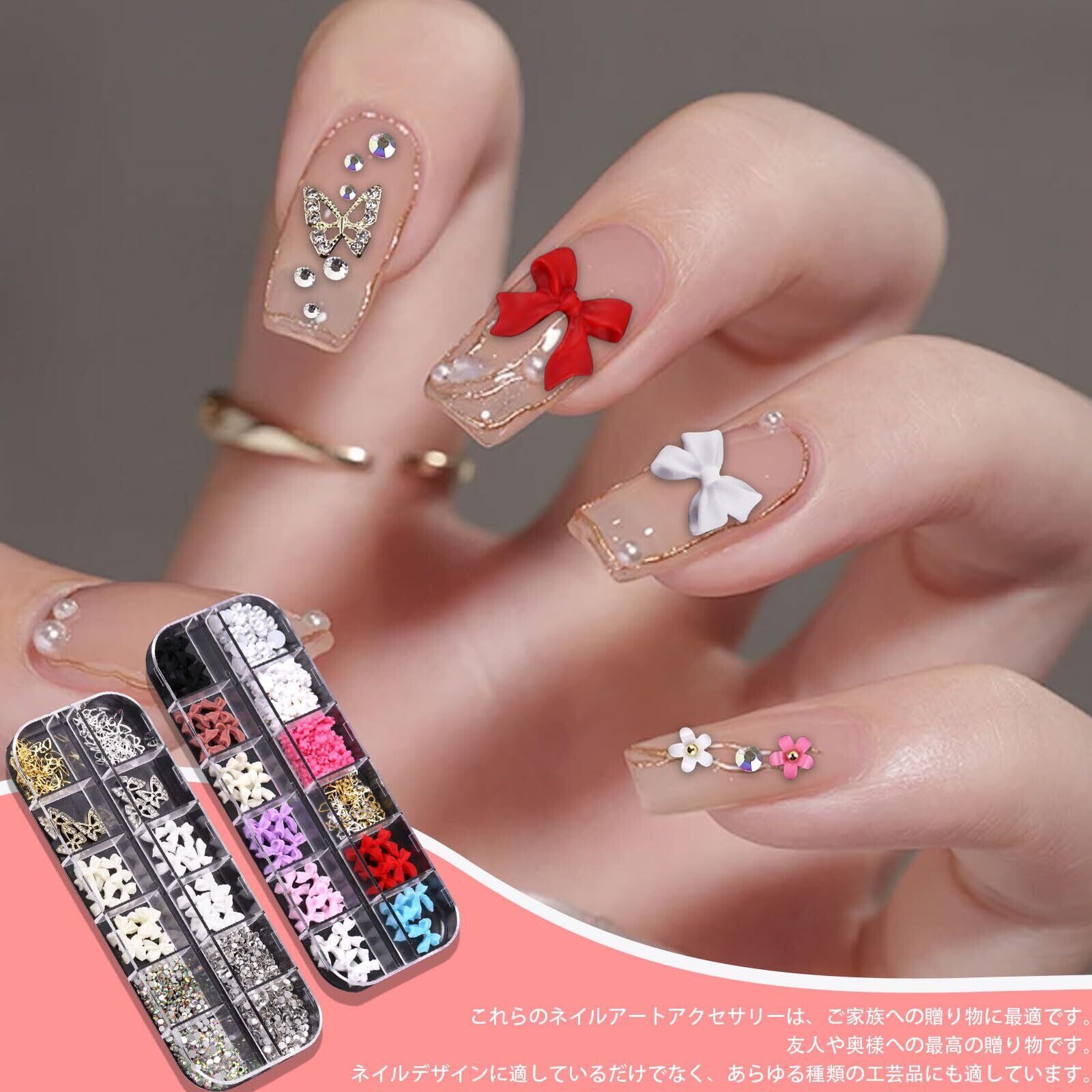 【ネイルパーツ】花、蝶々、リボン、パール、ラインストーンなどの可愛いネイルパーツがセットになって登場!おしゃれで存在感があります。