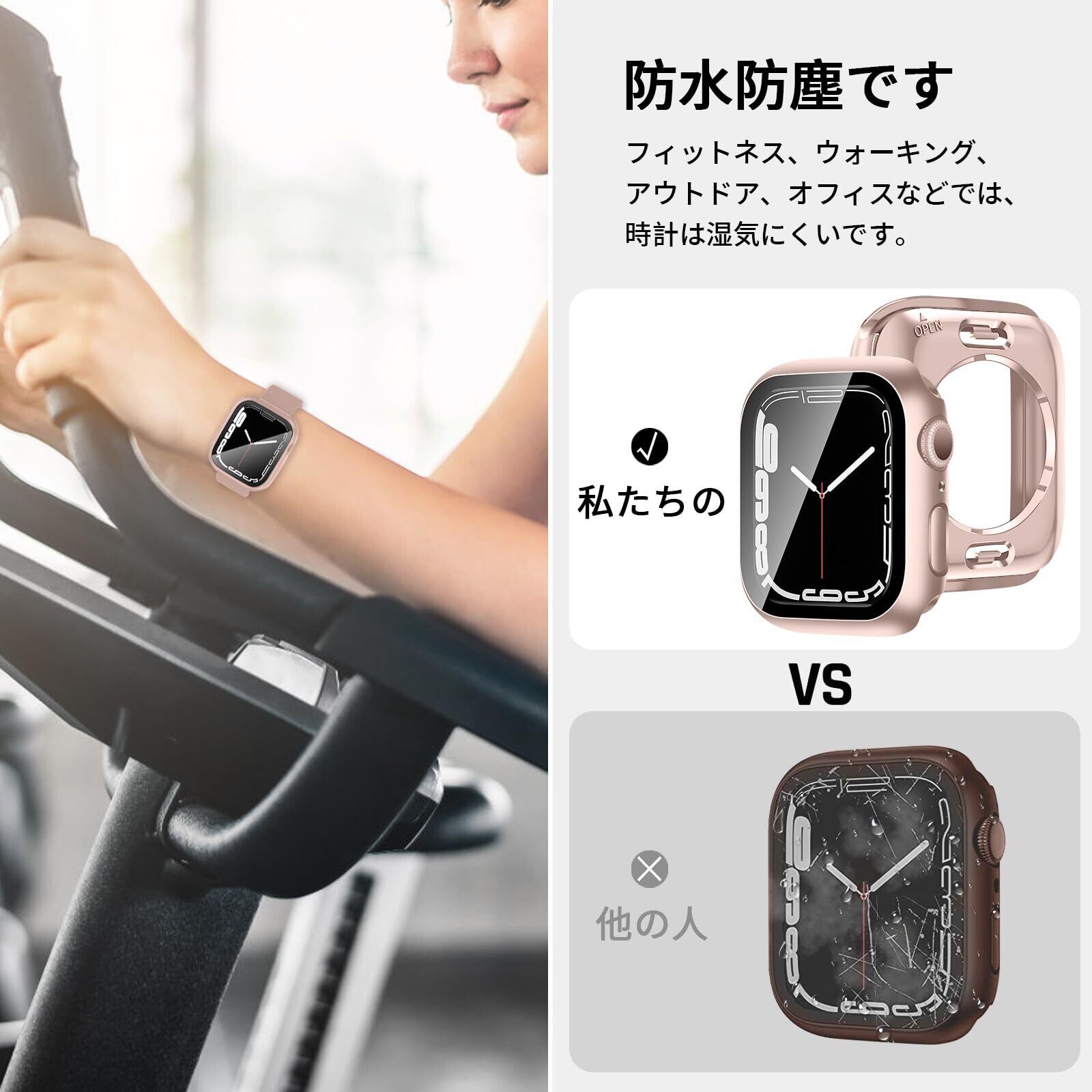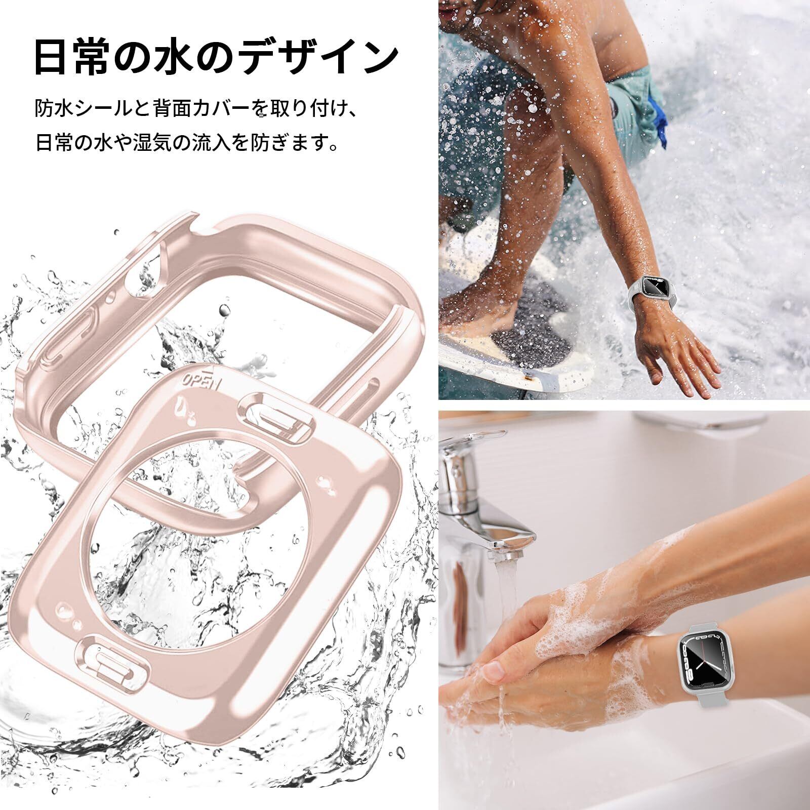 【360ど度 防水設計】Apple Watch ケース特殊加工による360ど度 防水設計により、 手を洗う時はもちろん汗をかいた時、シャワーを浴びた時にもかかわらずにアップルウォッチをご使用できます。 ※アップルウォッチ本来の防水性能を向上させるものではありません。プールや海などの水場でのご使用時はアップルウォッチの説明に従い、スキューバダイビング、ウォータースキーなど、水圧が高くなったり、所定の水深より深く潜るようなアクティビティはしないでください。