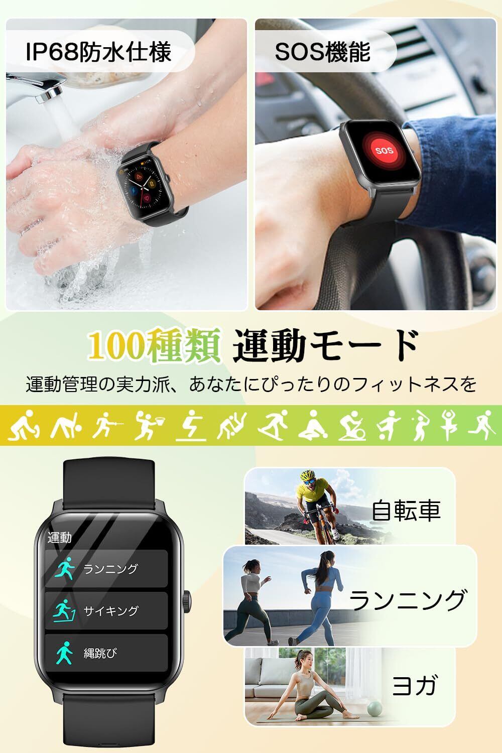 【100種類の運動モード&IP68高級防水】アウトドアスポーツ、トレーニング、ダンス、ボクシング、ボールゲーム、スノースポーツ、水スポーツ、レジャースポーツの中で100種類のスポーツがご利用頂けます。例え:ランニング、自転車、バレエ、ジャズダンス、ビリヤード、卓球、ハンドボール、卓球、ハンドボール、水上スキー、カヤック、ラフティング、釣りなど。運動データ、歩数計、活動量計、距離などを記録します。また、IP68の防水性を持っているので、日常生活の汗や雨、水しぶきからも保護され、手洗いや洗顔時にも取り外す必要がありません。ただし、水泳や温泉、入浴時の使用は避けてください。