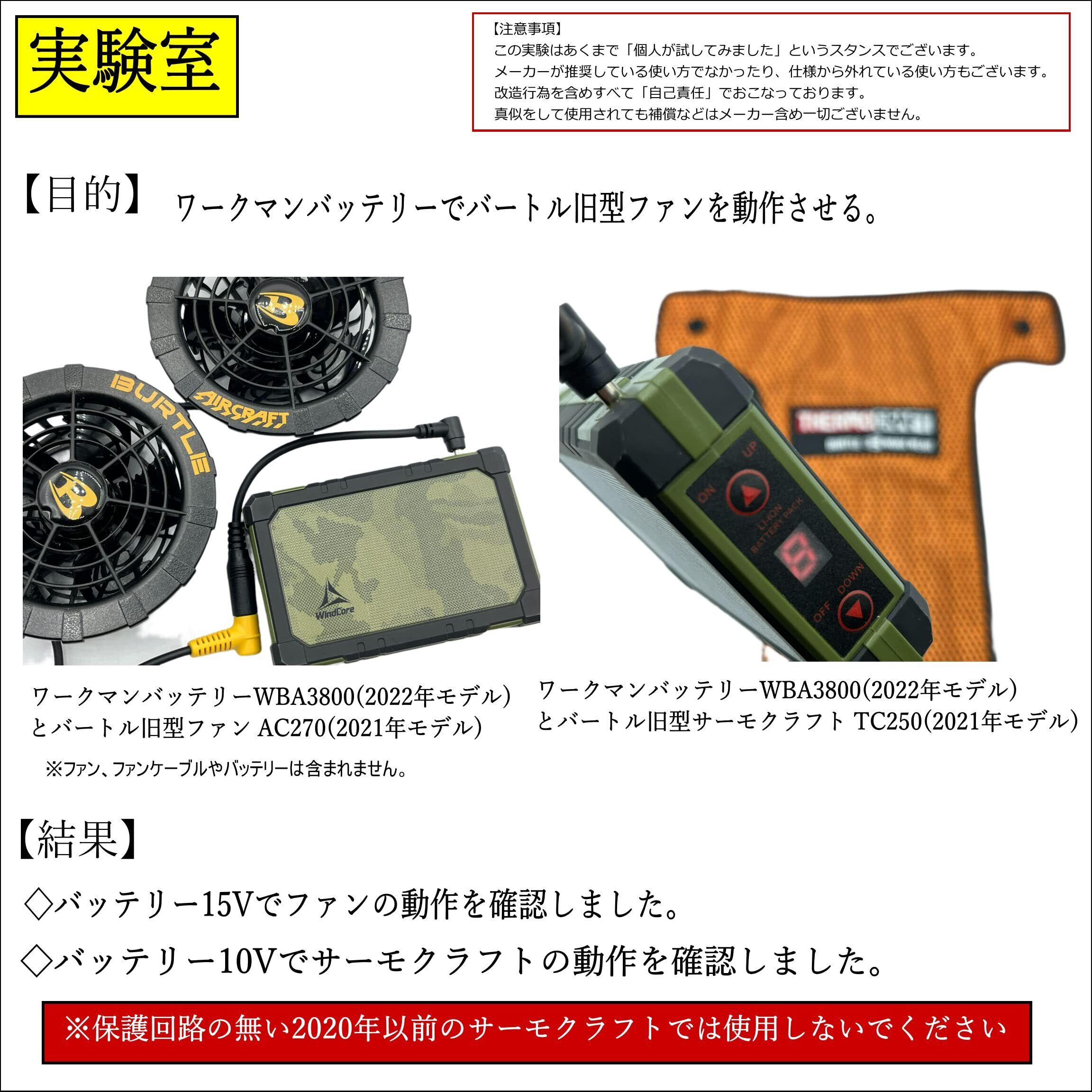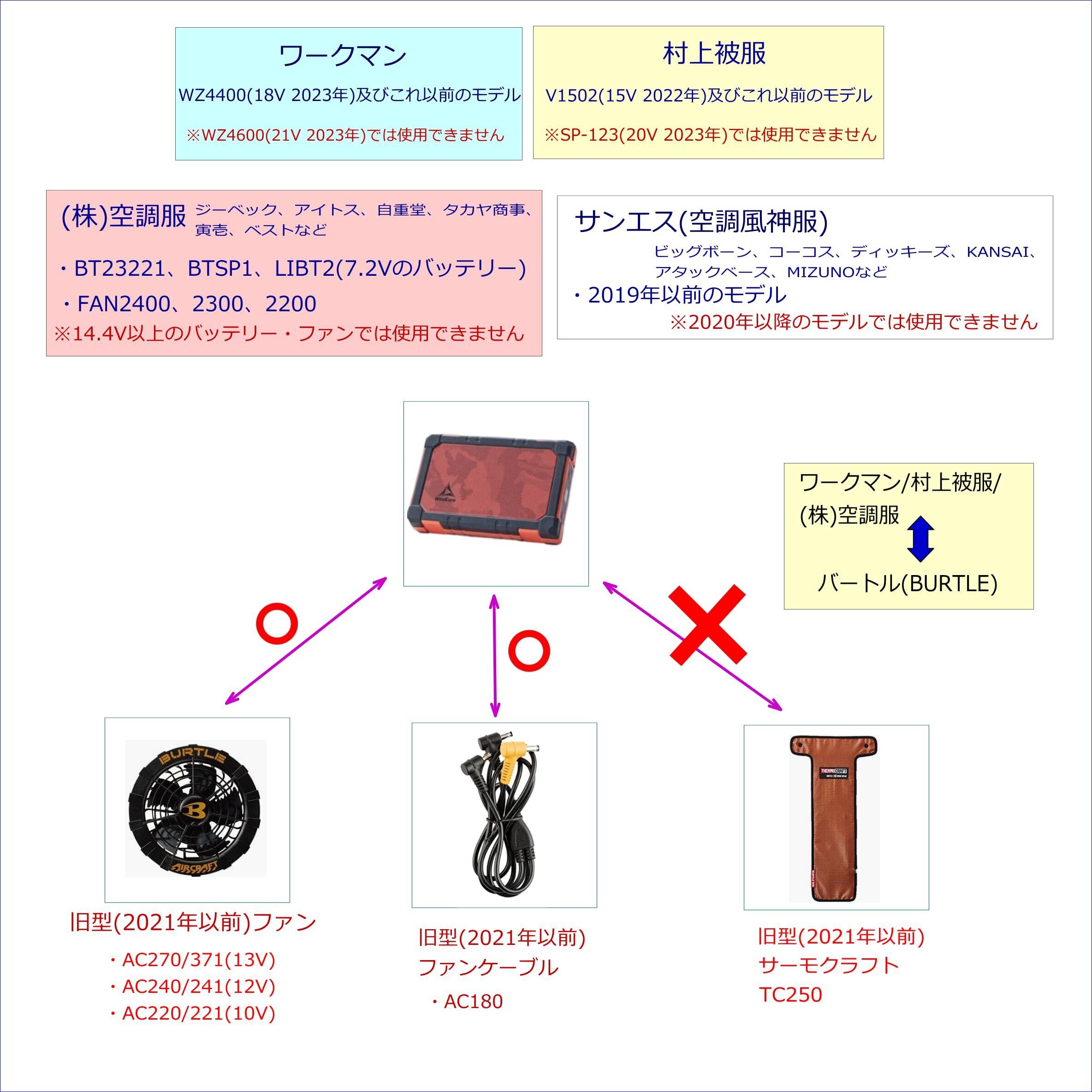 【動作情報】 □バートル(BURTLE) ファン(2021年以前モデル) AC270/271(13v)、AC240/241(12v)、AC220/221(10V)をワークマンや村上被服のバッテリーで動作することができます。 ※ワークマンの最新機種 21V WZ4600(2023年)では使用できません ※村上被服の最新機種 19V V1901(2023年)では使用できません ※バッテリーの出力に対応したファンでないと使用できません。
