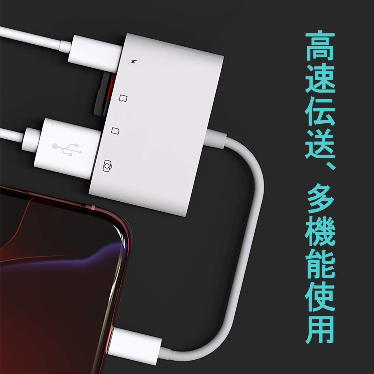●【iOS専用カードリーダー&充電機能】IOS 対応の四つスロット:SDカードスロット×1、マイクロSDカードスロット×1、USB-Aポート(カメラを接続可)×1、充電用IOSコネクタメス×1。このSD カードリーダーは、Phone/Pad専用 カードリーダーです。この製品を使用すると、写真やビデオをPhone / Padに簡単に転送できます。データの転送中に簡単に充電することもできます。電力不足の問題がありません。