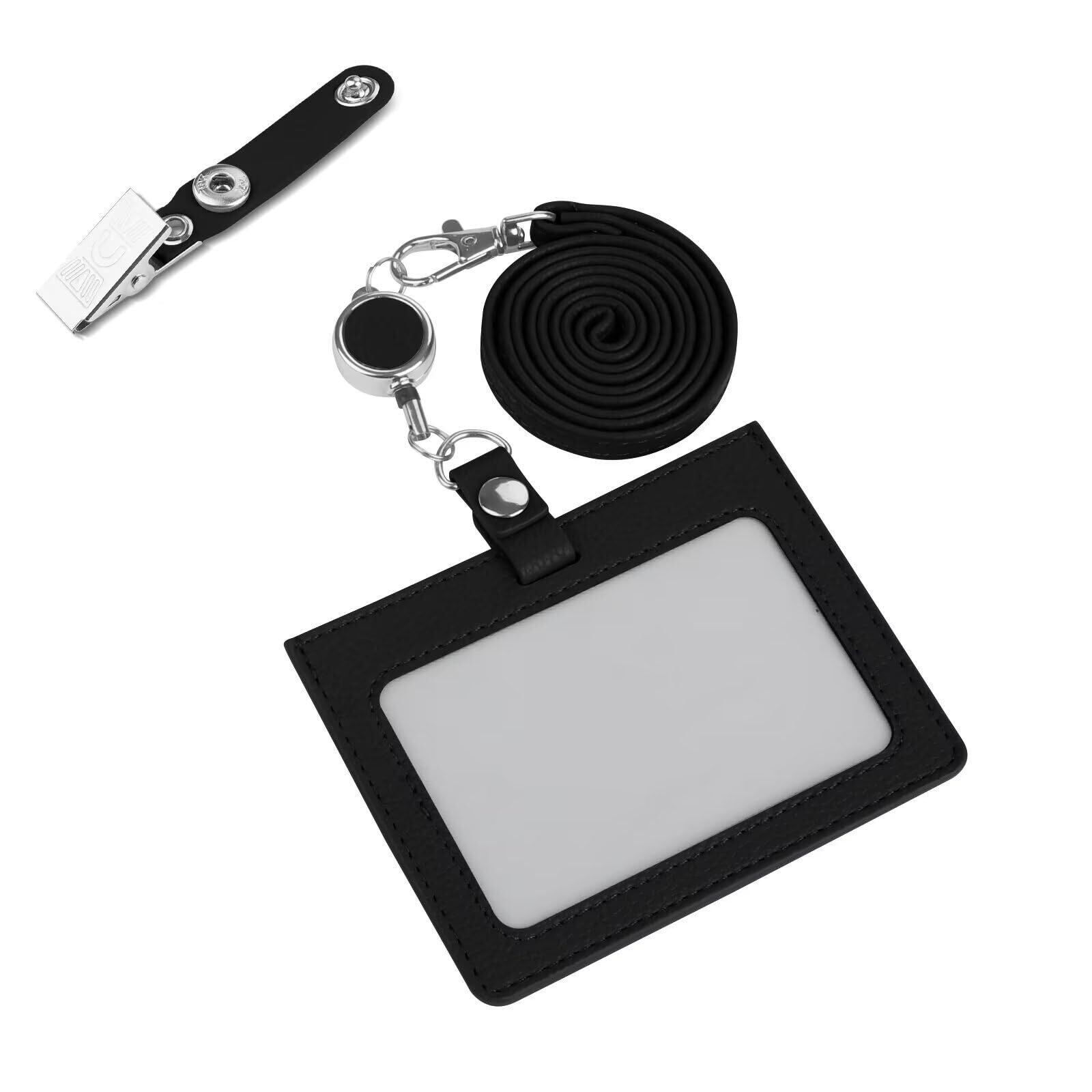 Chillchi IDカードホルダー カード入れ ネックストラップ 名札ケース 定期入れ 名刺入れ 伸縮リール式 パスケース カードケース 首掛け ショルダー 社員証 ケース 入れ 首かけ 展示会 セット 横型 両面用 ストラップ カード カード掛け レザー カード入れ 通勤 通学 男女兼用 レディース メンズ 名札 吊り下げ イベントスタッフ パス 名刺 カード3枚収納 クリップ付き 【 B-ブラック 】