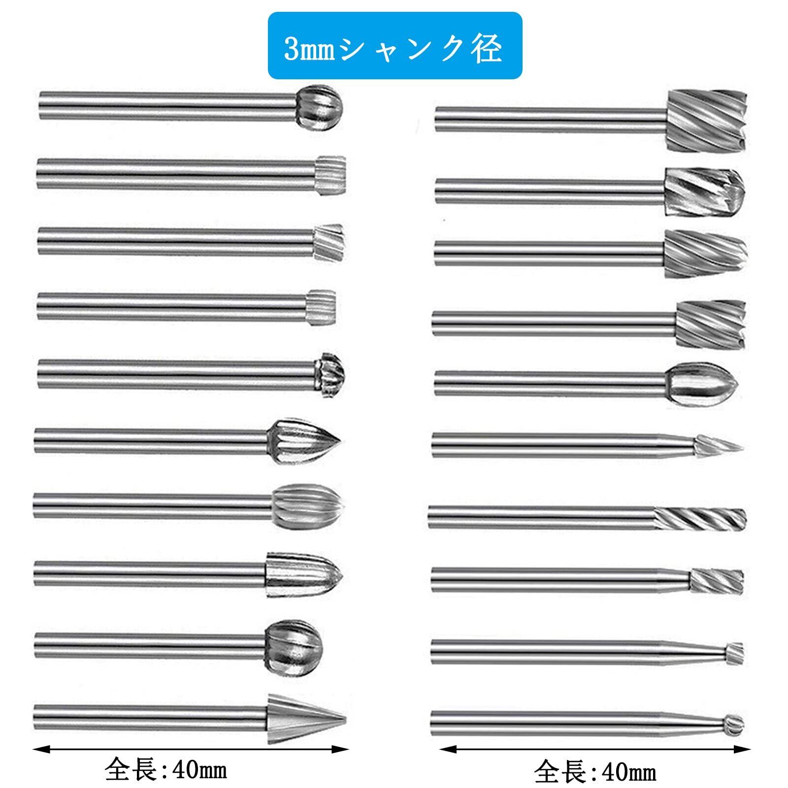 セット内容:20本リュータービット 、シャンク径:3mm 、 全長:40mm、材質:タングステン鋼、20種類セット ケース付。