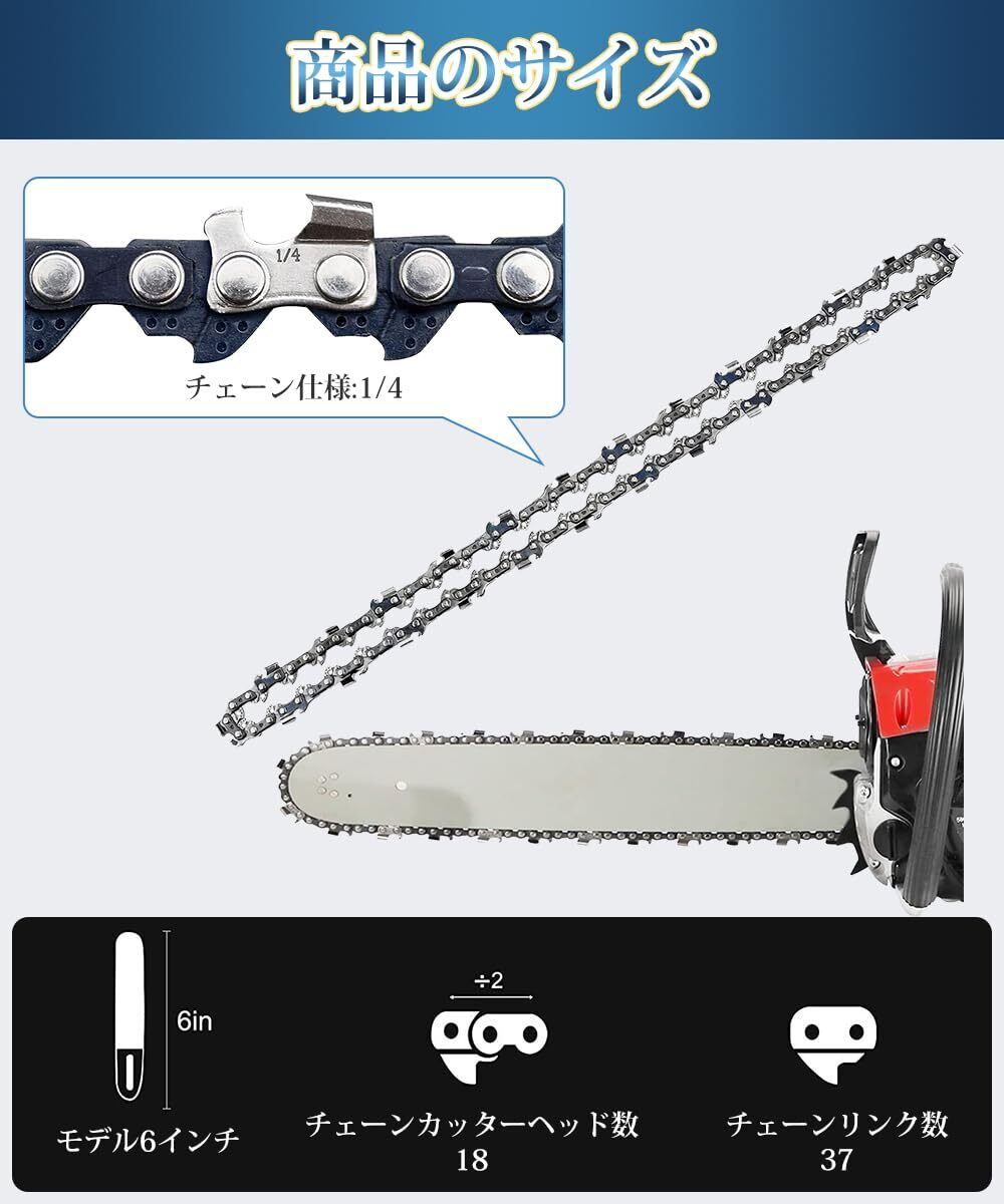 【製品仕様】サイズ:6インチチェーン、材質:65Mn、規格:37Eチェーンリンク・18Tカッター、パッケージ内容:2本入り。チェーンが2つ付いているので、予備のチェーンを残すことができて、とても便利で手頃な価格です。