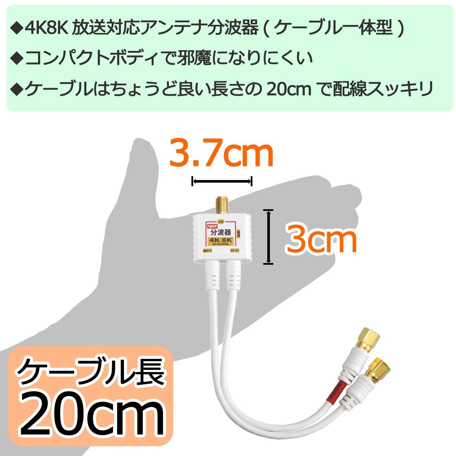 分波器ケーブル長:20cm、入力端子:F型ジャック、出力端子:F型接栓プラグ、付属ケーブル長:5m、F型プラグ(L型)-F型コネクタ(接栓ネジタイプ)、カラー:ホワイト、プラグ部分:金メッキ