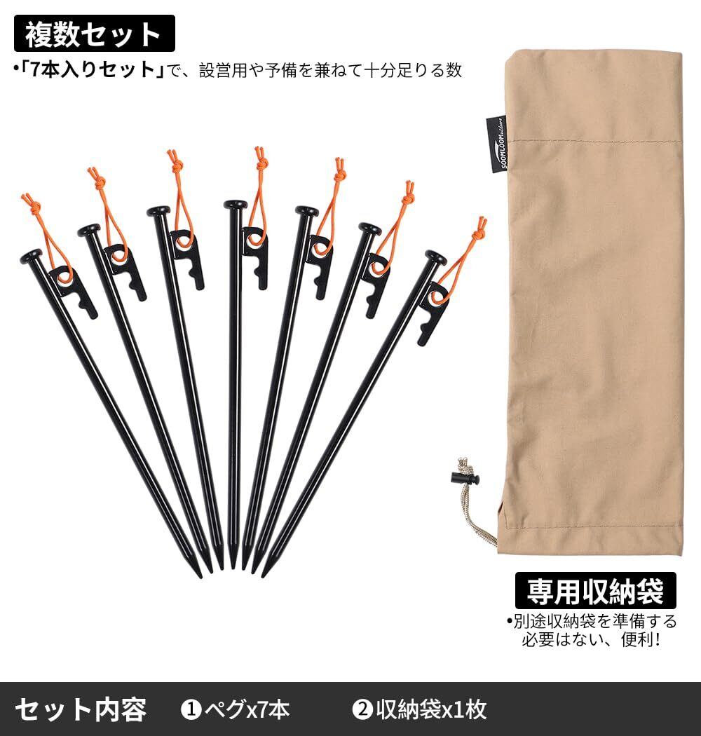 セット数量:キャンプに行く際には、ペグの数が複数の予備に用意しておくことがお勧め、本製品は「7本入りセット」となっていて、テントやタープ設営用や予備を兼ねて十分足ります。