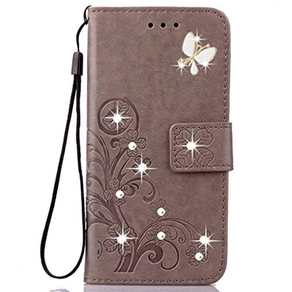 らくらくスマートフォン me F-01L ケース シン フィット らくらくホン らくらくスマホ おしゃれ 純色 四つ葉のクローバーの印 PUレザー 上絵 手帳型 カード入れ f-01l 財布カバー スタンド機能 耐衝撃 防塵 耐久性 装着やすい 吸着の機能 キラキラ 胡蝶 ラインストーン デコ メチャ可愛い F-01L らくらくスマートフォン me スマホカバー (グレー)